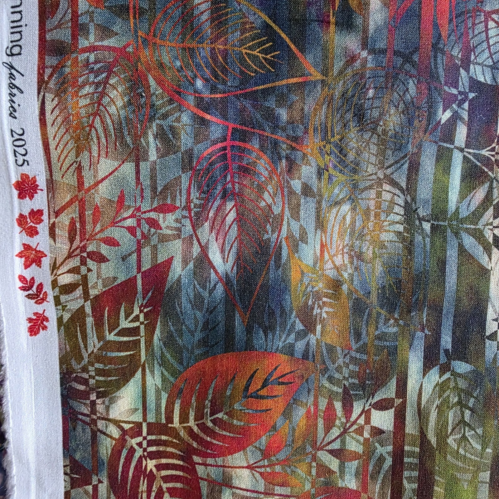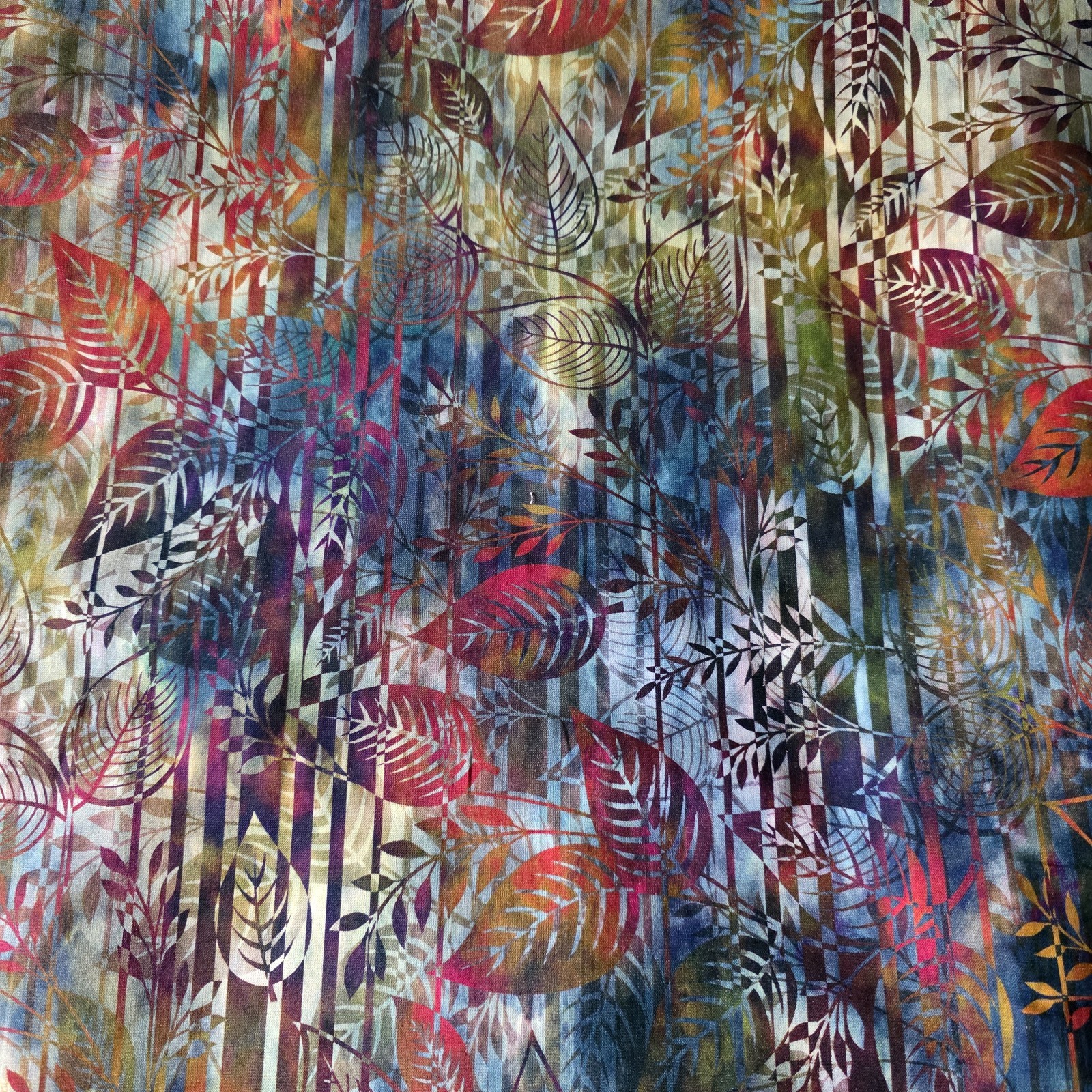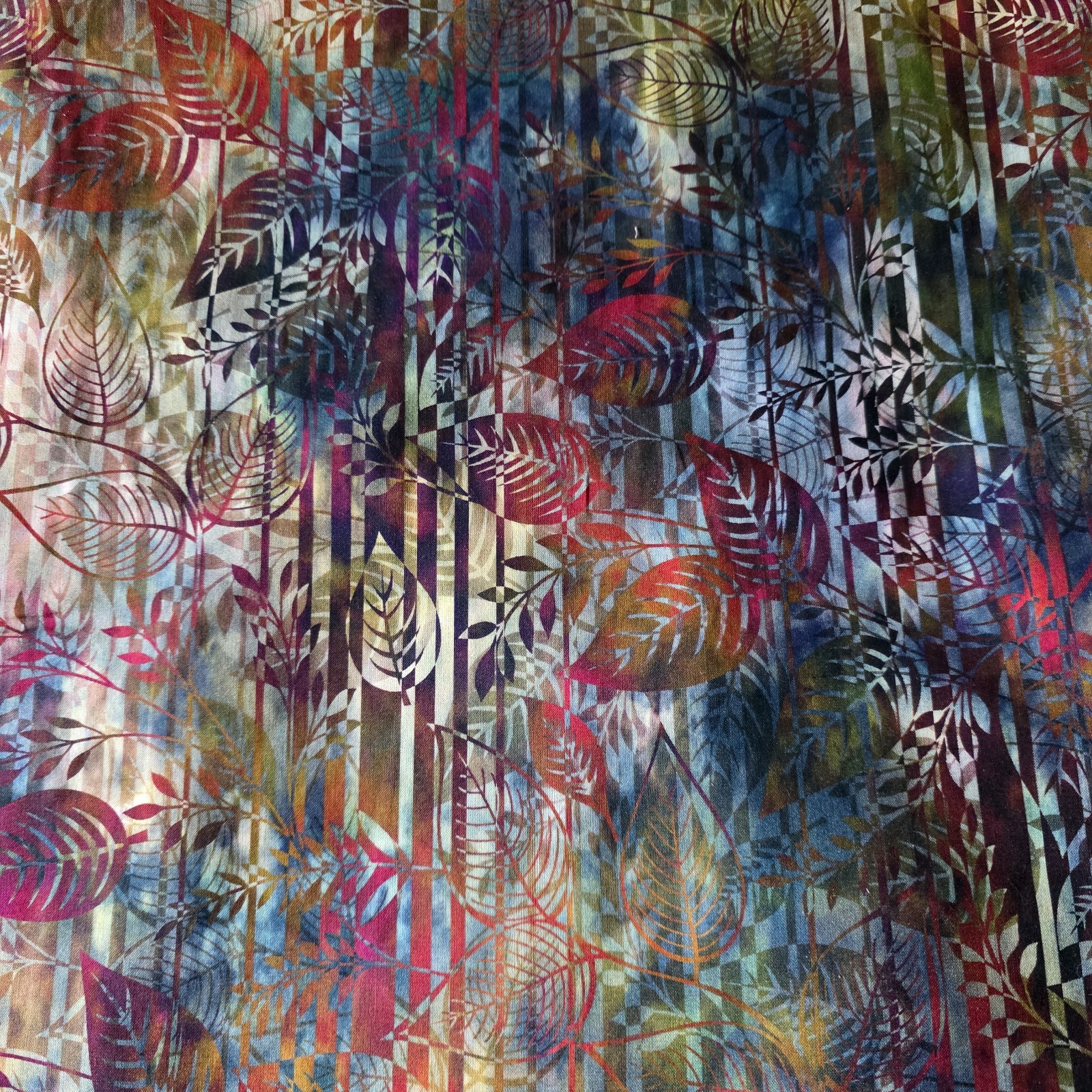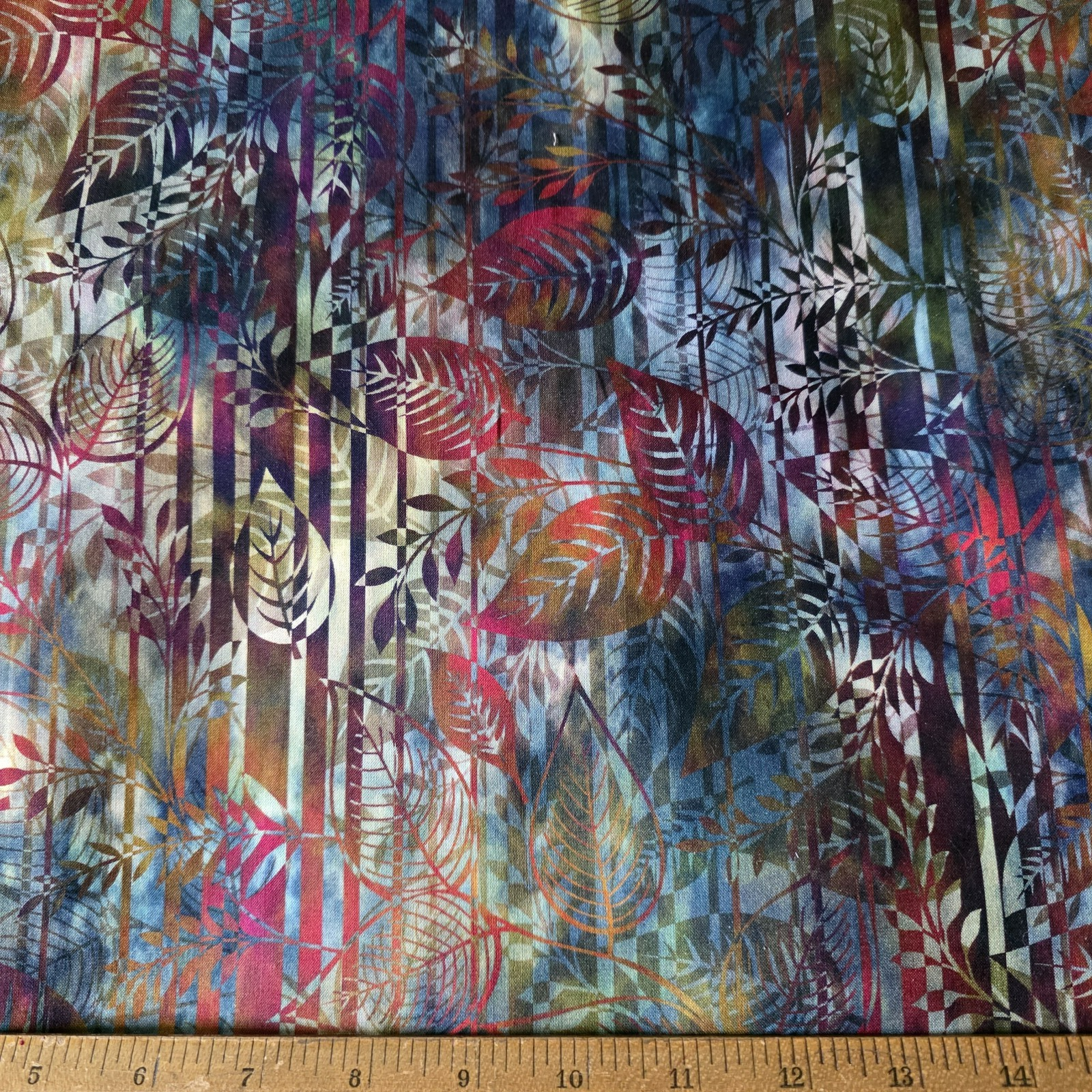 Beautiful print of stenciled leaves on a stripey layered background, lots of visual interest, looks like a batik. Fabulous for a quilt, tunic, dress, skirt, bags, and more! From Jason Yenter’s “Falling Leaves” collection by In The Beginning Fabrics.