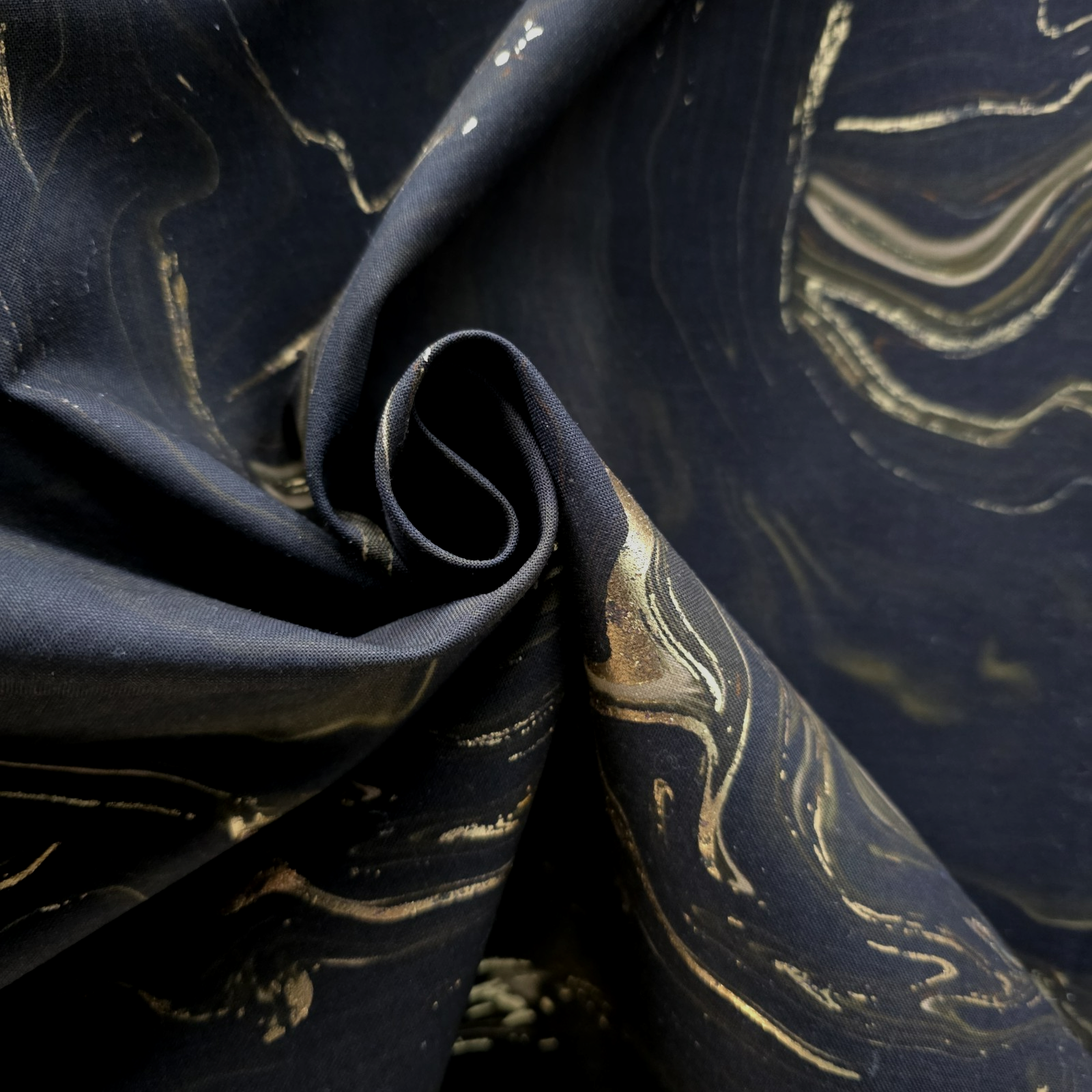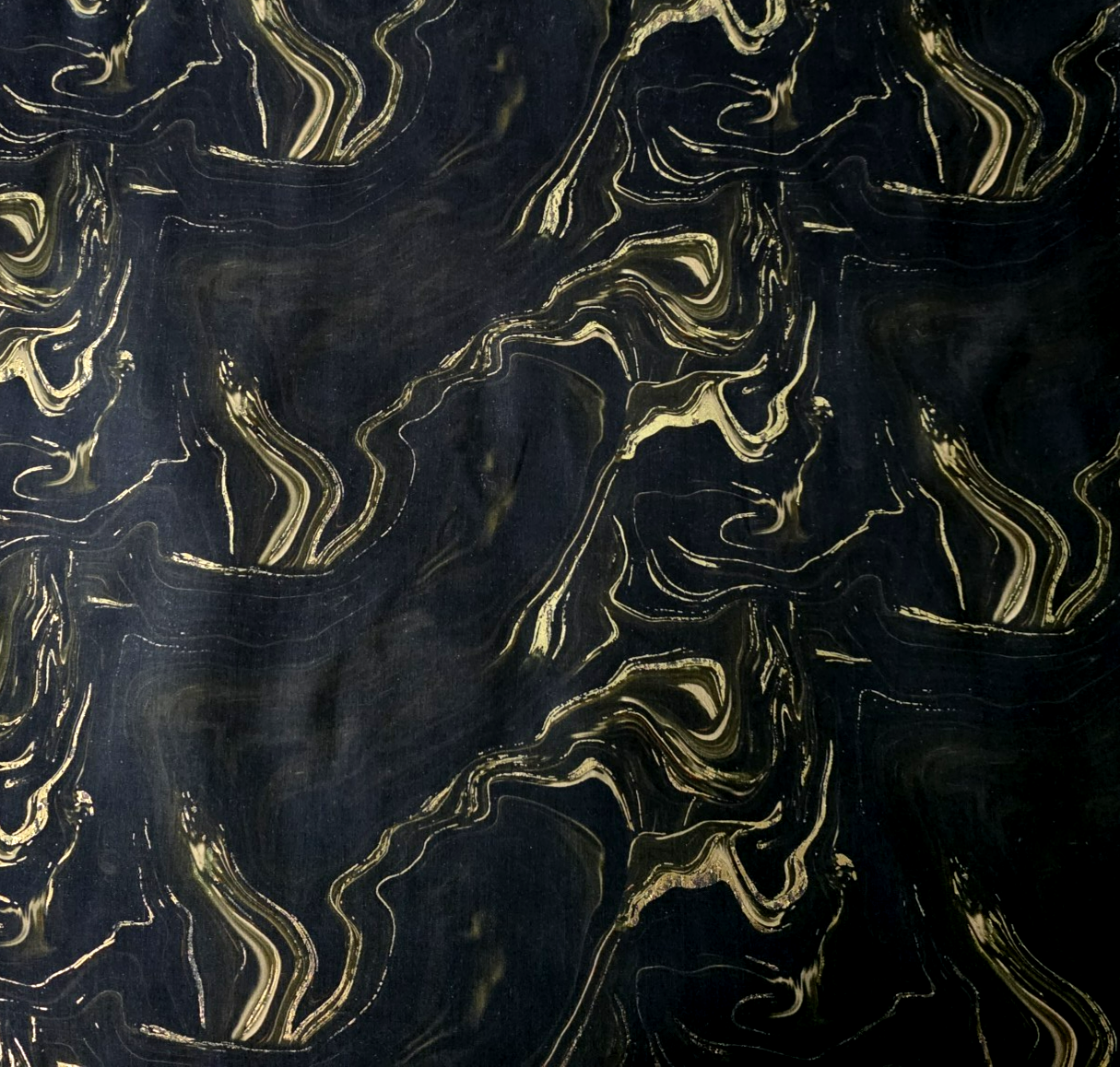 This is a wonderful printed cotton with metallic gilding from Camelot Fabrics, this is Gilded Ripples. Black and brown is marbled with metallic gold. This is perfect for quilts, quilted jackets, shirts, garments, home dec, little bags, and more! Soft, but sturdy, with great drape.