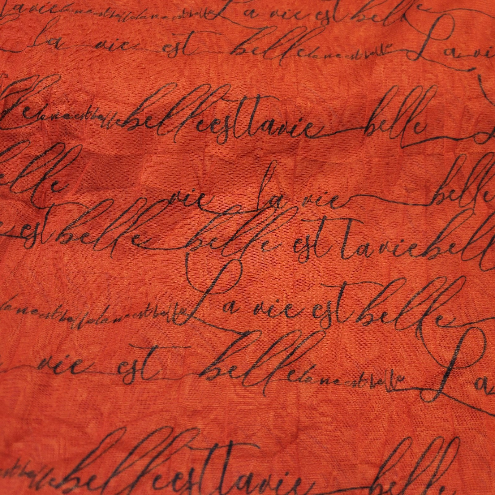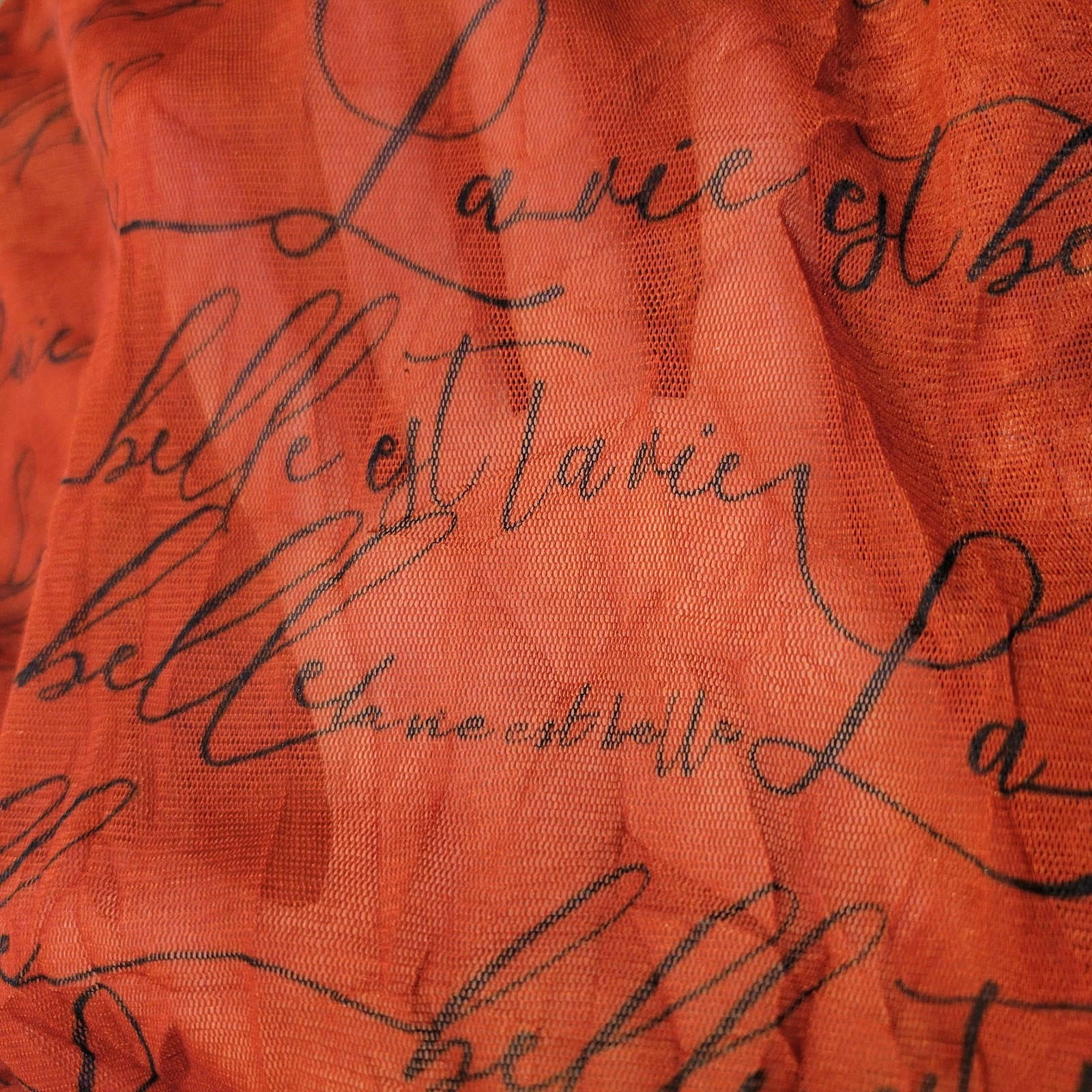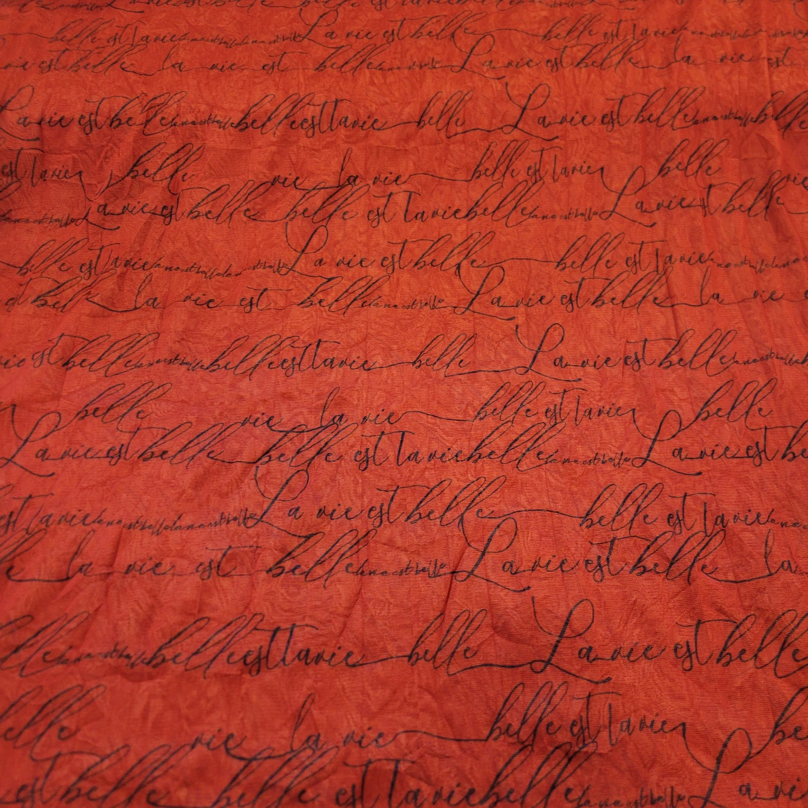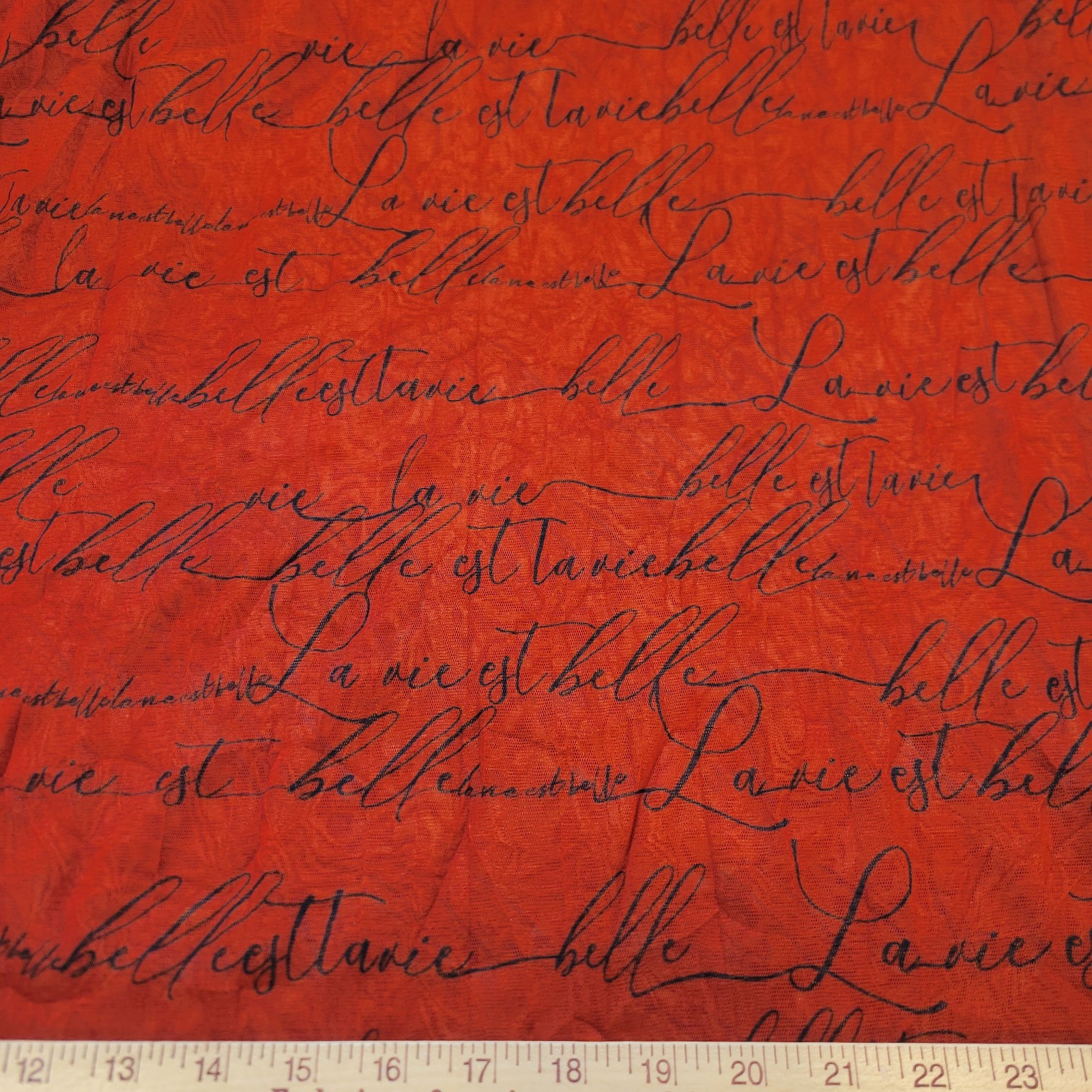 Soft, fine, stretch mesh with a beautiful print of black cursive words in French (“La vie est belle” which means ‘life is beautiful’) on a rich, dark, red-orange ground. We also have this in a blued-red. This is a wonderful fabric for light summery tops, dresses, and more! Designer overstock!