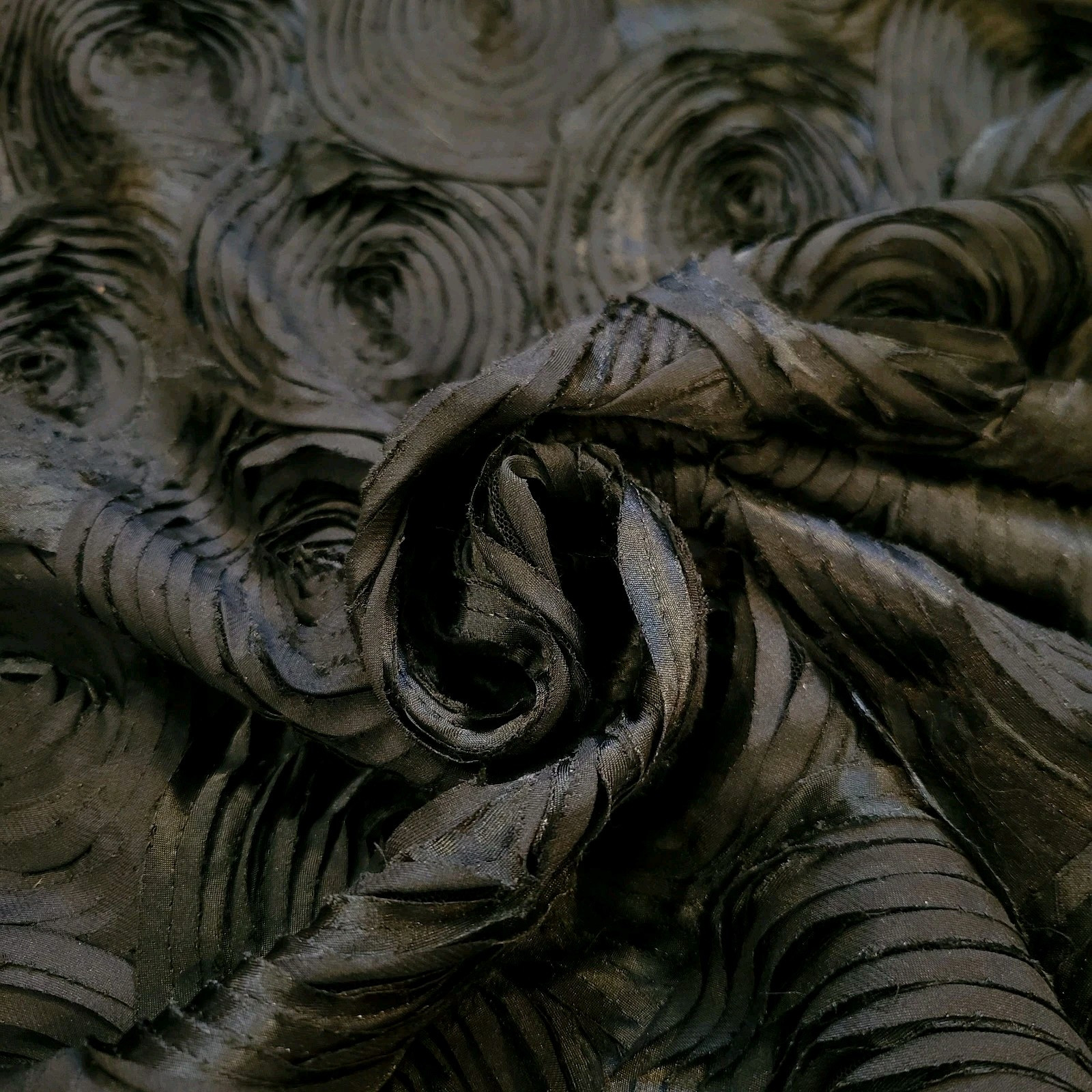 Fine black tulle with stitched flowers formed from circles made of bias black ribbon. Very tactile, and would be absolutely smashing as a dress, skirt (skirt of a ballgown with a contrast top?), or jacket (paired with jeans or a formal gown!), or just an adorable tunic paired with jeans for lunch with friends! Flowers are about 3-4″ diameter.