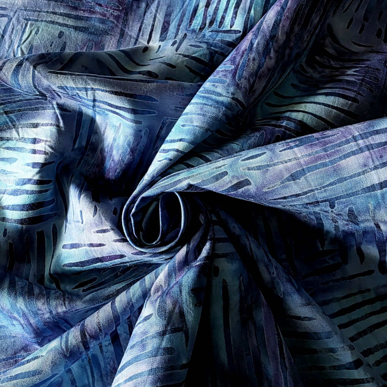 This is a fabulous cotton shirting/quilting batik fabric from Indonesia, made by hand with traditional techniques featuring a wonderful pattern of groups of lines rotating orientation, all in shades of turquoise blues and purples. Because this fabric is dyed, not printed, the design goes all the way through the fabric, so it’s ideal for garments or accessories where the reverse will show.