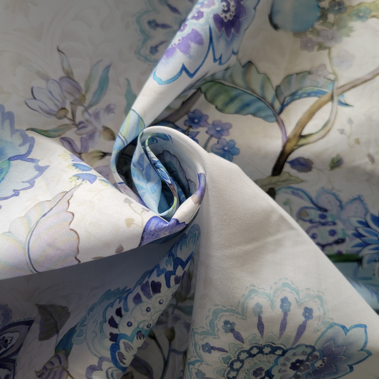 Beautiful watercolor-style floral branches in cool blues, greens, and purples, with butterflies on white in border stripe bands running down the length of the fabric. There are 4 bands across the width of the fabric. Perfect for trimming and banding quilts and garments. This cotton print would be fabulous in a quilt, tunic, dress, skirt, bags, and more! From Jason Yenter’s Daydreams collection by In The Beginning Fabrics. We have most of this collection, all listed separately.
