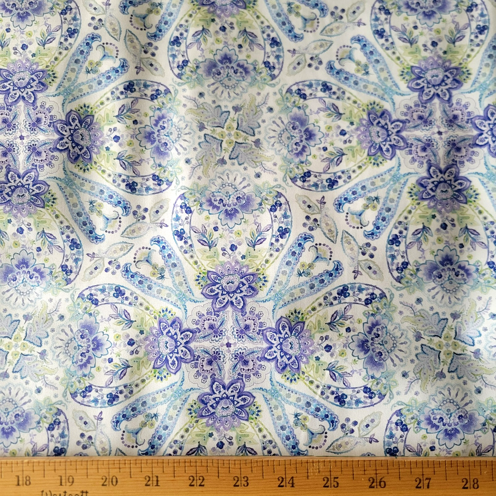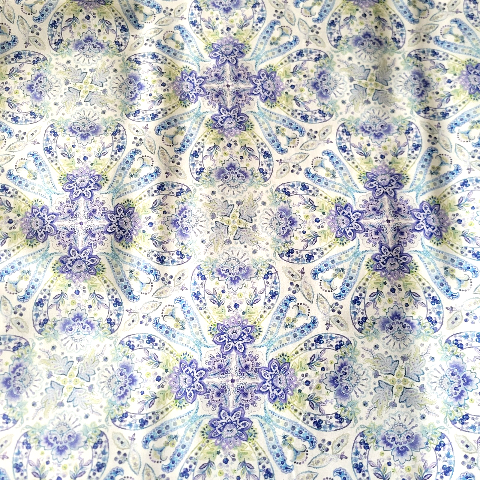 Beautiful watercolor-style floral arranged in a geometric quatrefoil in cool blues, greens, and purples on white. This cotton print would be fabulous in a quilt, tunic, dress, skirt, bags, and more! From Jason Yenter’s Daydreams collection by In The Beginning Fabrics. We have most of this collection, all listed separately.