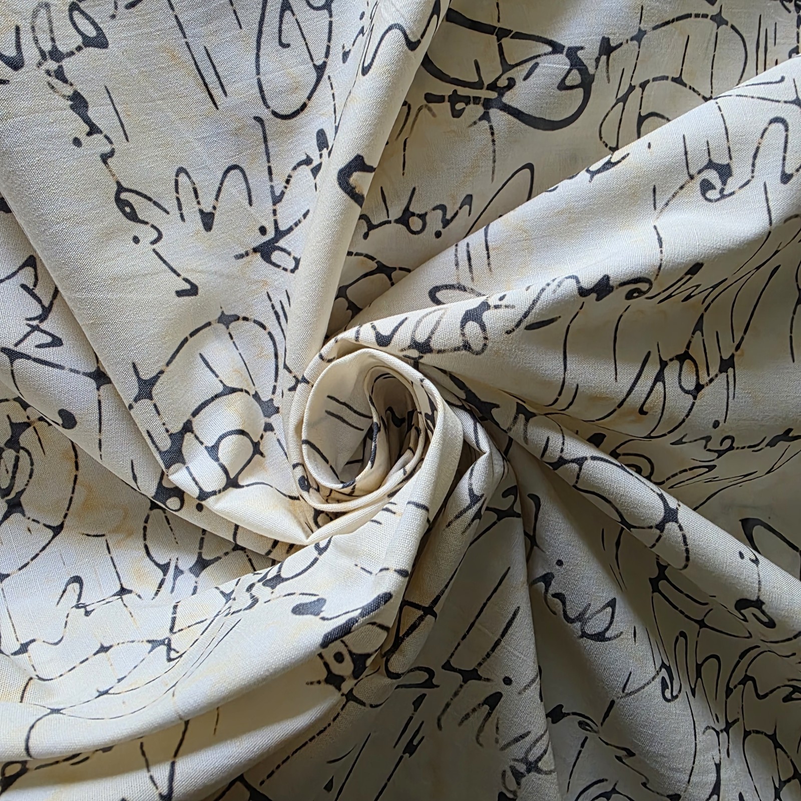 This is a fabulous cotton shirting/quilting batik fabric from Indonesia, made by hand with traditional techniques featuring a wonderful pattern of a bold “graffiti” signature in cursive in gray on a mottled beige ground. Because this fabric is dyed, not printed, the design goes all the way through the fabric, so it’s ideal for garments or accessories where the reverse will show.