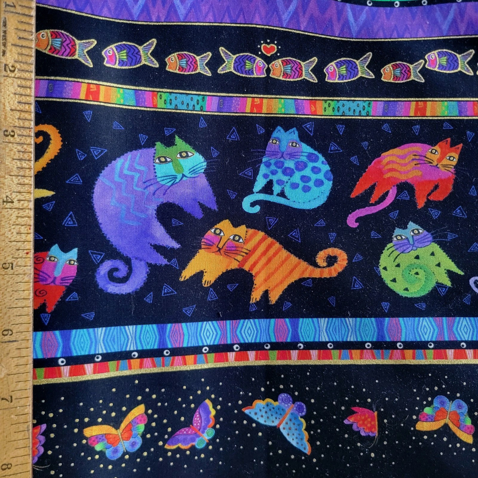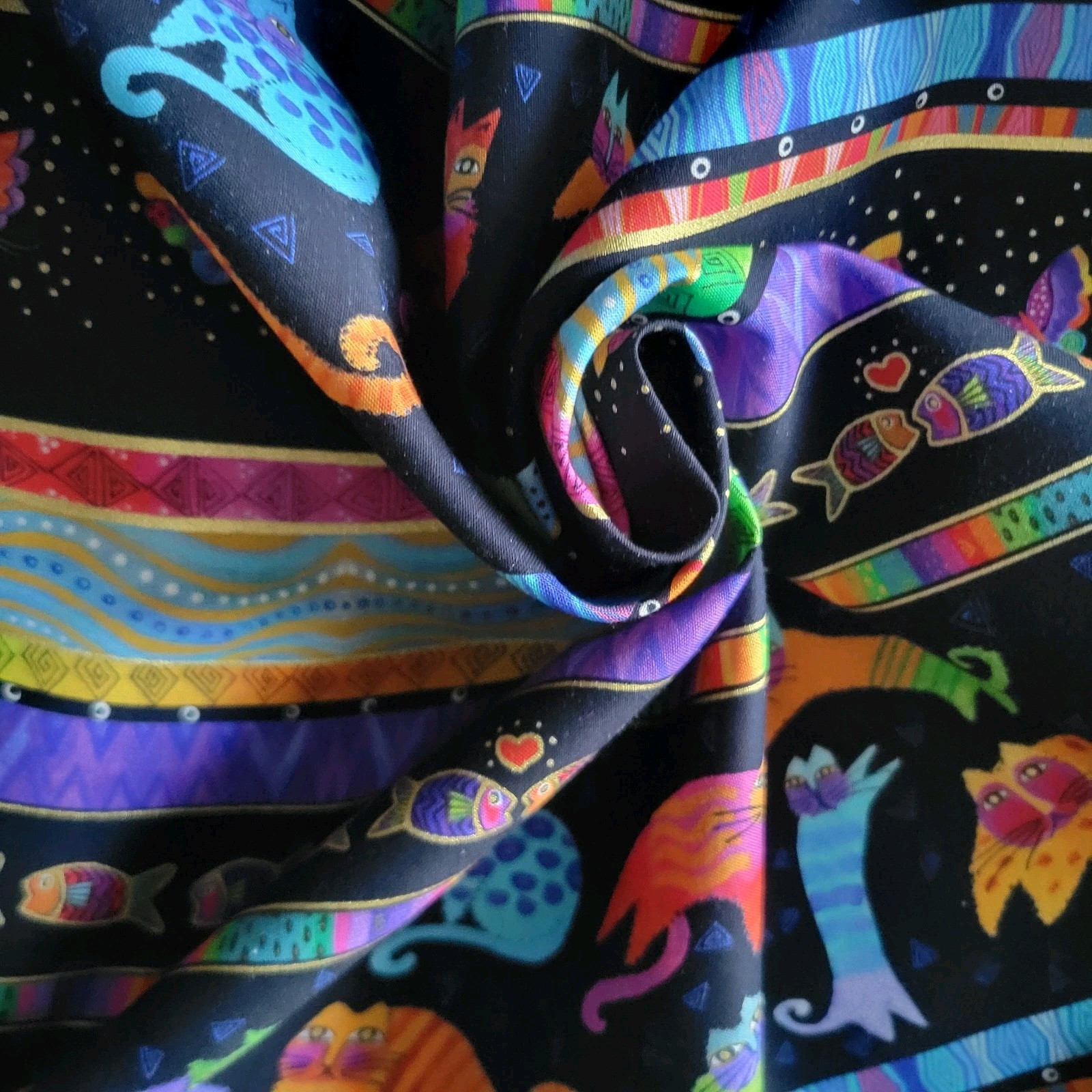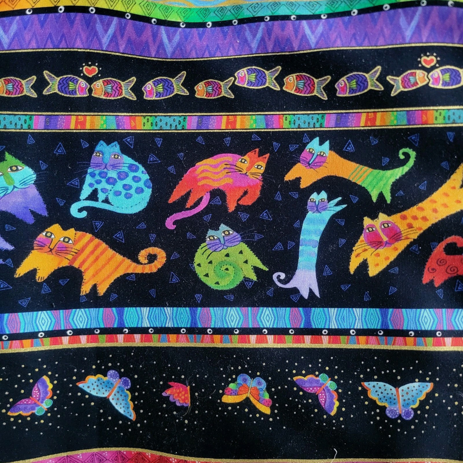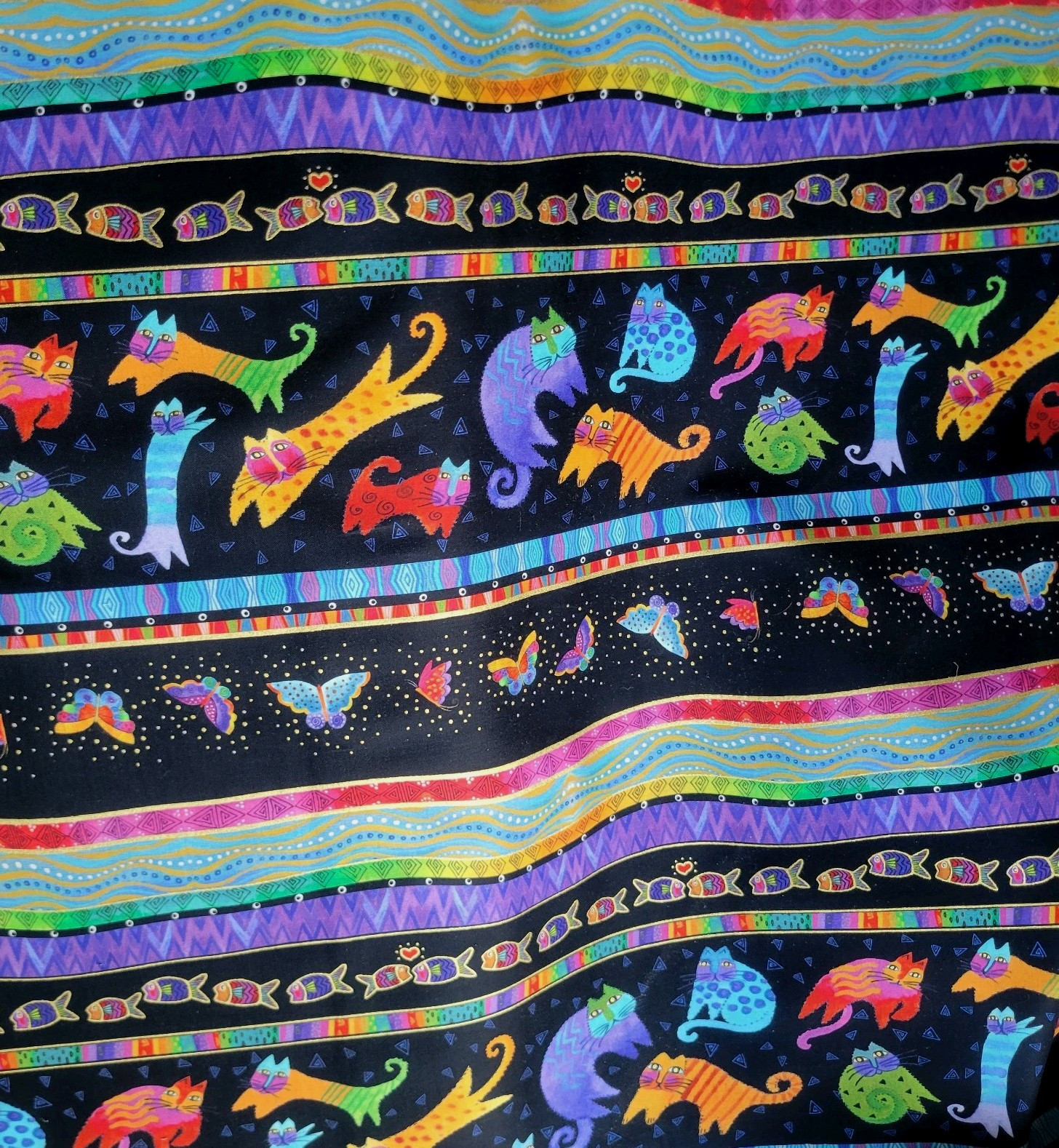 This is a fabulous cotton shirting/quilting fabric from Clothworks’ “Fantasticats” collection by Laurel Burch. We have several of the fabrics from this collection, listed separately. This one features a series of colorful wide bands with fish, cats, butterflies, and patterns, on black with metallic gold accents.