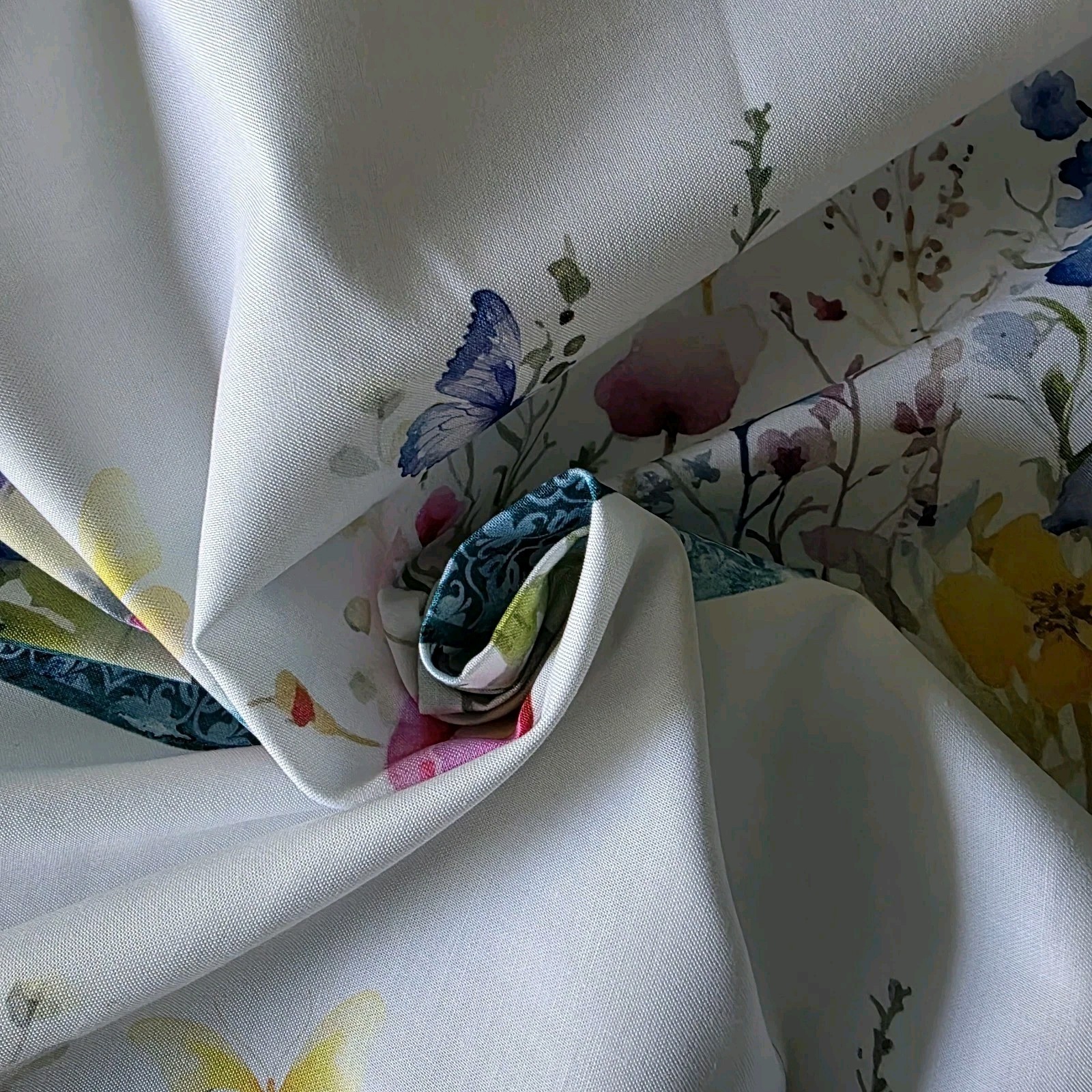 This is a fabulous cotton shirting/quilting fabric from In The Beginning Fabrics, this is from the Butterfly Fantasy collection by Jason Yenter. We have 3 fabrics from this collection, this one is the border stripe pattern, and features 4 bands of soft watercolor flowers rooted in a patterned teal band. The bands are stacked on each other and run down the length of the fabric, so you get continuous strip of whatever length you buy (see last photo)!! This is pattern 2BF.
