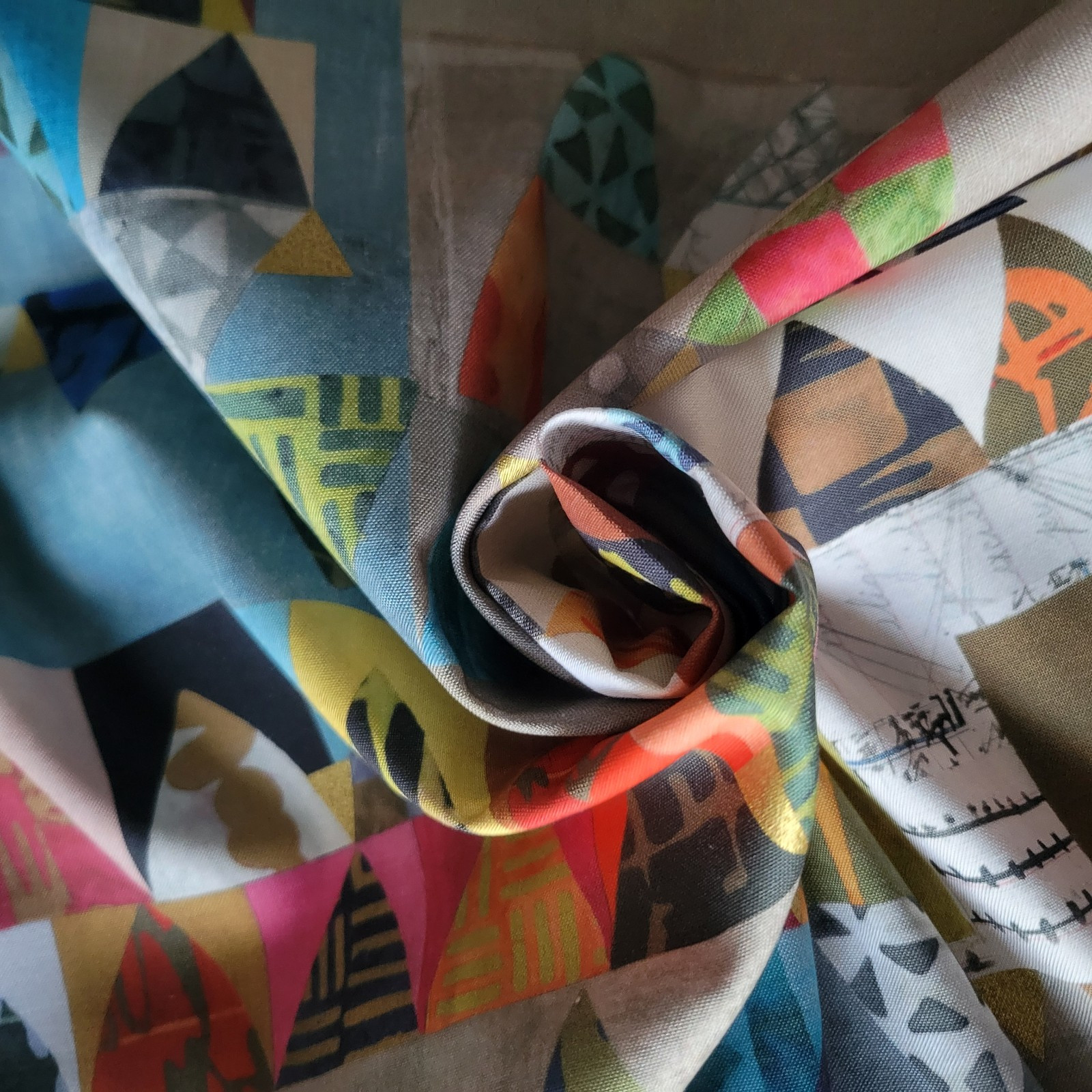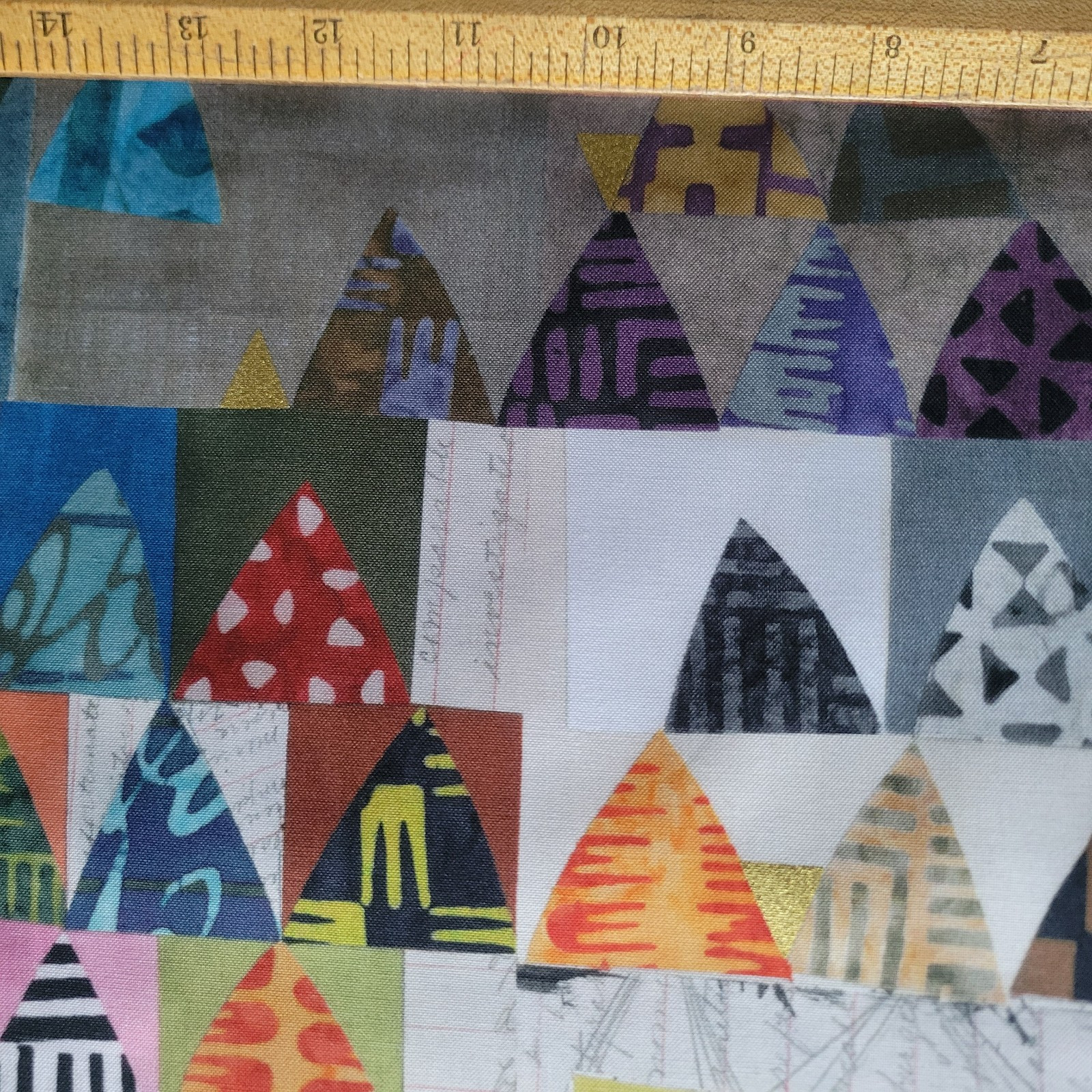 Collaged colorful little triangles (about 1-2″) on a mostly-neutral print ground. This gorgeous fabric is a wonderful selection from Marcia Derse, this is Open Space from the Stenographer’s Notebook collection, and would be fabulous in a quilt or used as a tunic or skirt or ? . This is such a cute print!!