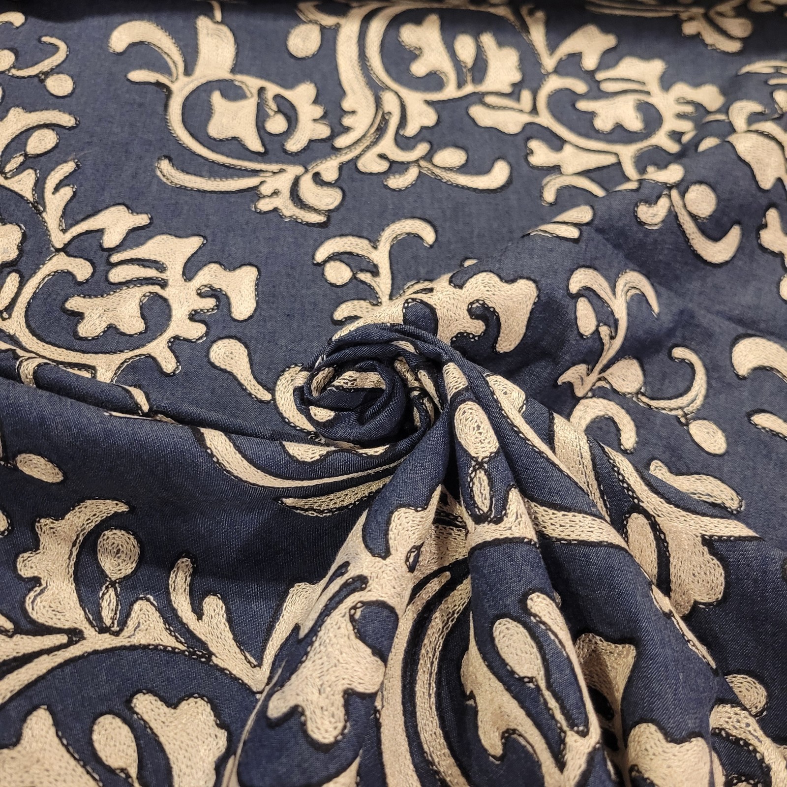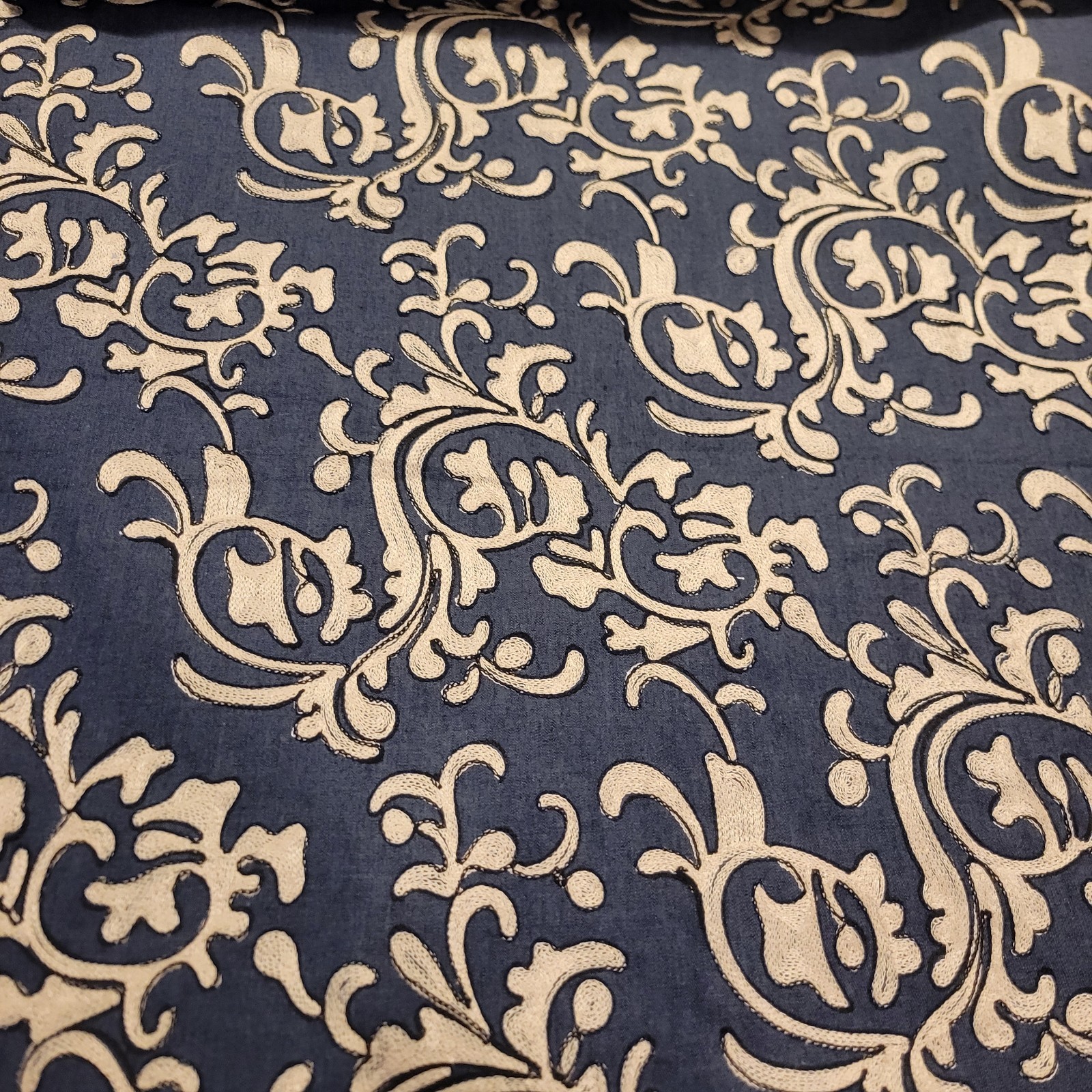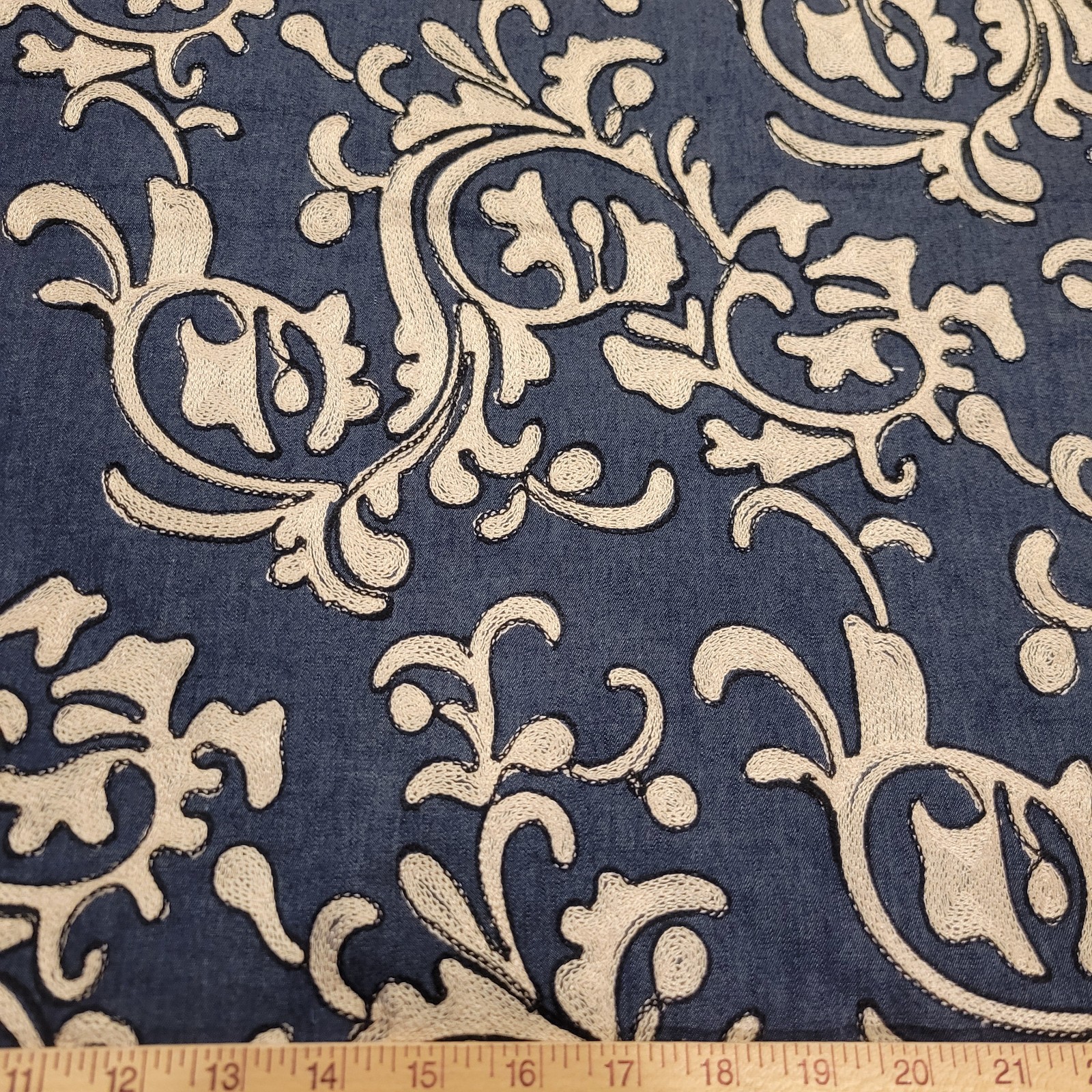 This is a wonderful cotton chambray (like a lightweight denim) in denim blue with crewel embroidery in white outlined with black. Design is abstract scrolls. Shirting weight, this gorgeous fabric would be ideal for shirts, dresses, light summery skirts, tunics, etc.