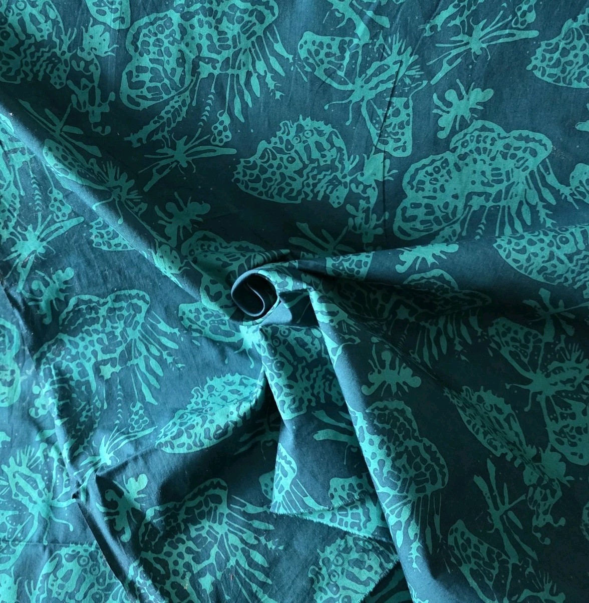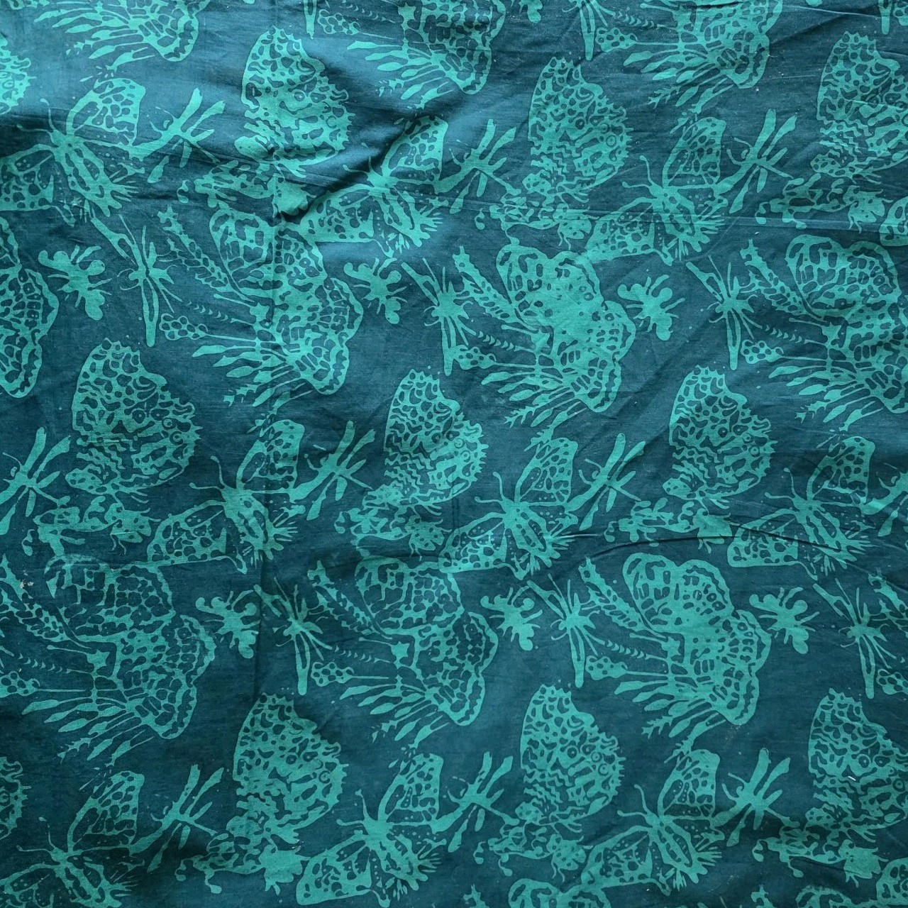 This is a fabulous cotton shirting/quilting batik fabric from Indonesia, made by hand with traditional techniques featuring a wonderful pattern of larger butterflies & moths in tonal rich teal green. Because this fabric is dyed, not printed, the design goes all the way through the fabric, so it’s ideal for garments or accessories where the reverse will show.