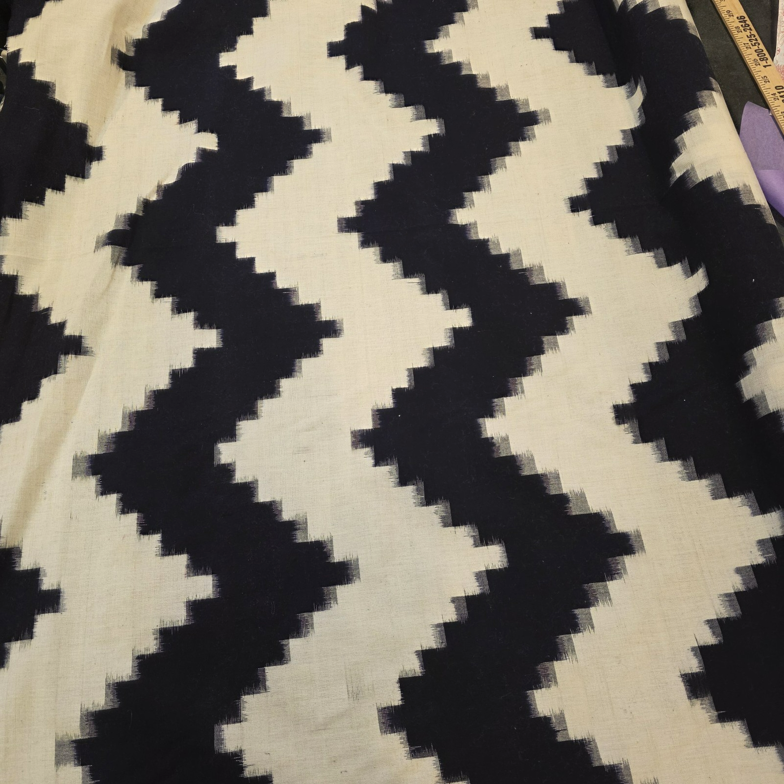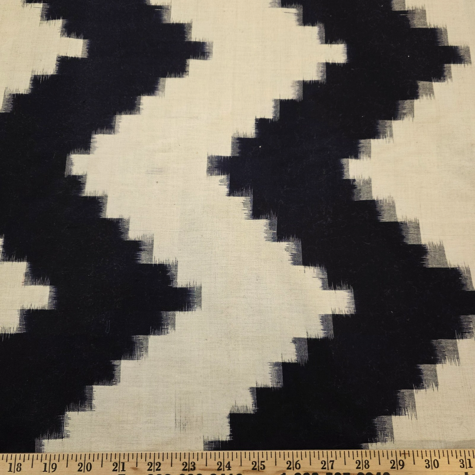 Ikat large-scale stepped zigzag chevron in darkest midnight navy blue and off-white. Color bands run across the width of the fabric. Weight is relatively light, and faintly semi-sheer against the light.