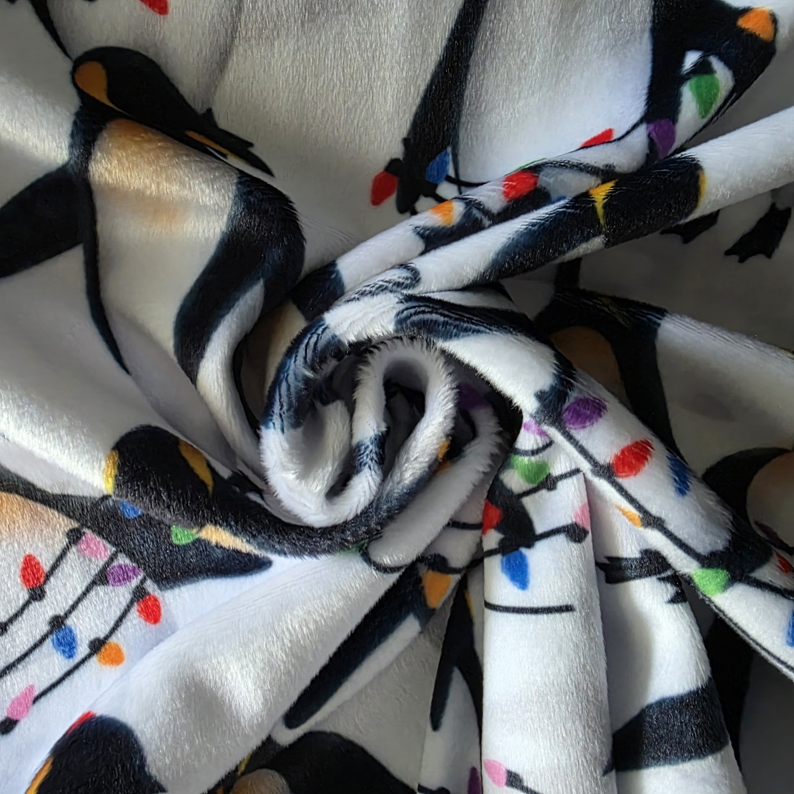 So soft and plush, this Minky Cuddle Fleece from Shannon, the premier plush fabrics company, features an adorable print of Emperor penguins wrapped in colorful Christmas/holiday lights. This fabric is great for cozy quilts, snuggly wraps, lap blankets, hats, scarves, light jackets for fall and spring, etc.