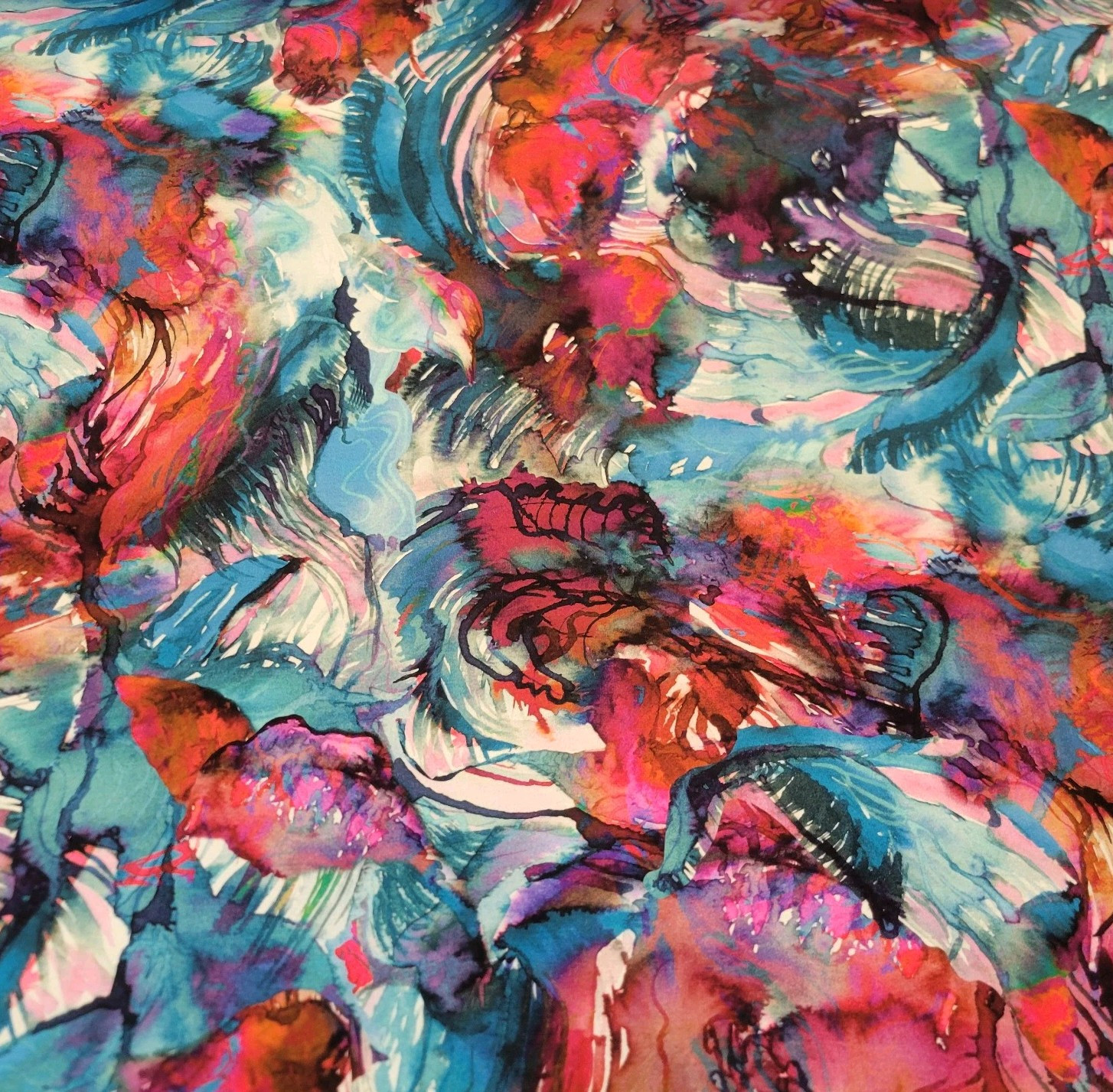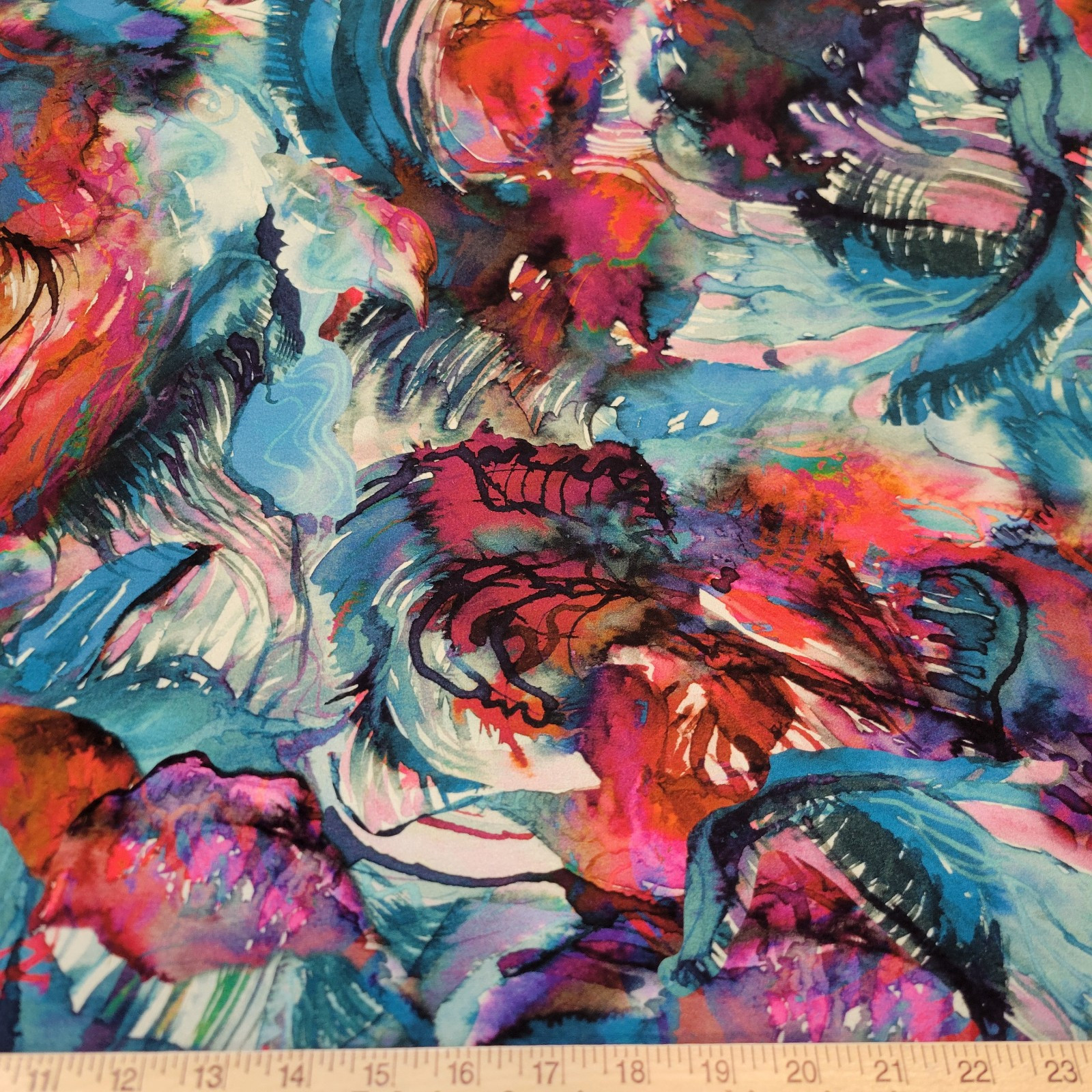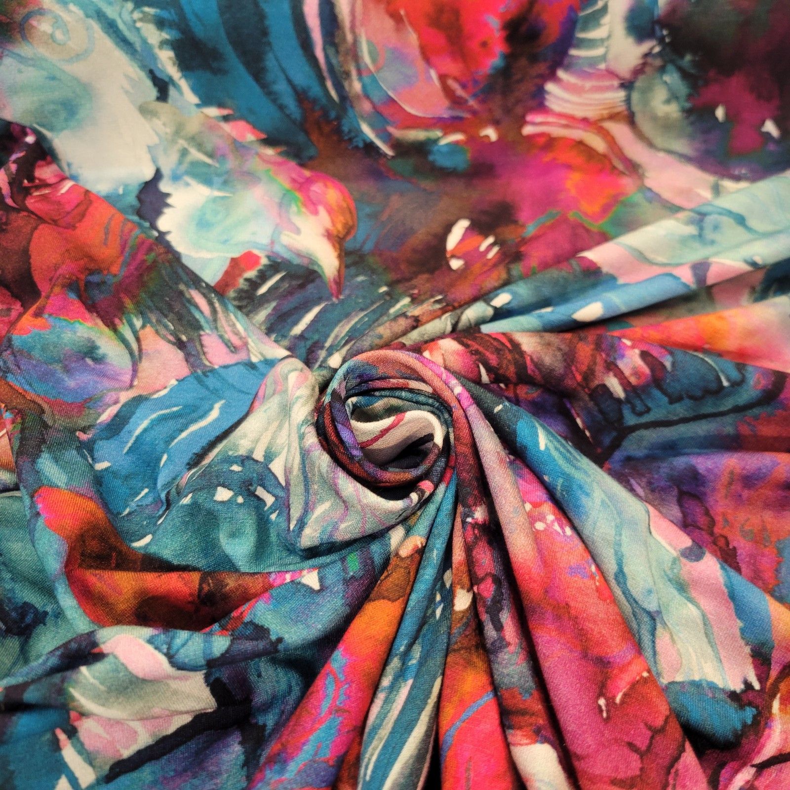 This is a lovely knit with a soft, smooth, hand, and a fantastic bold print, drenched with color and tropical flavor in cool jewel tones of turquoises and magentas. This great knit would be perfect for loungewear, t-shirts and tunics, wrap cardigans, dresses, and more, for kids or adults!! This is from a European mill, excellent quality.