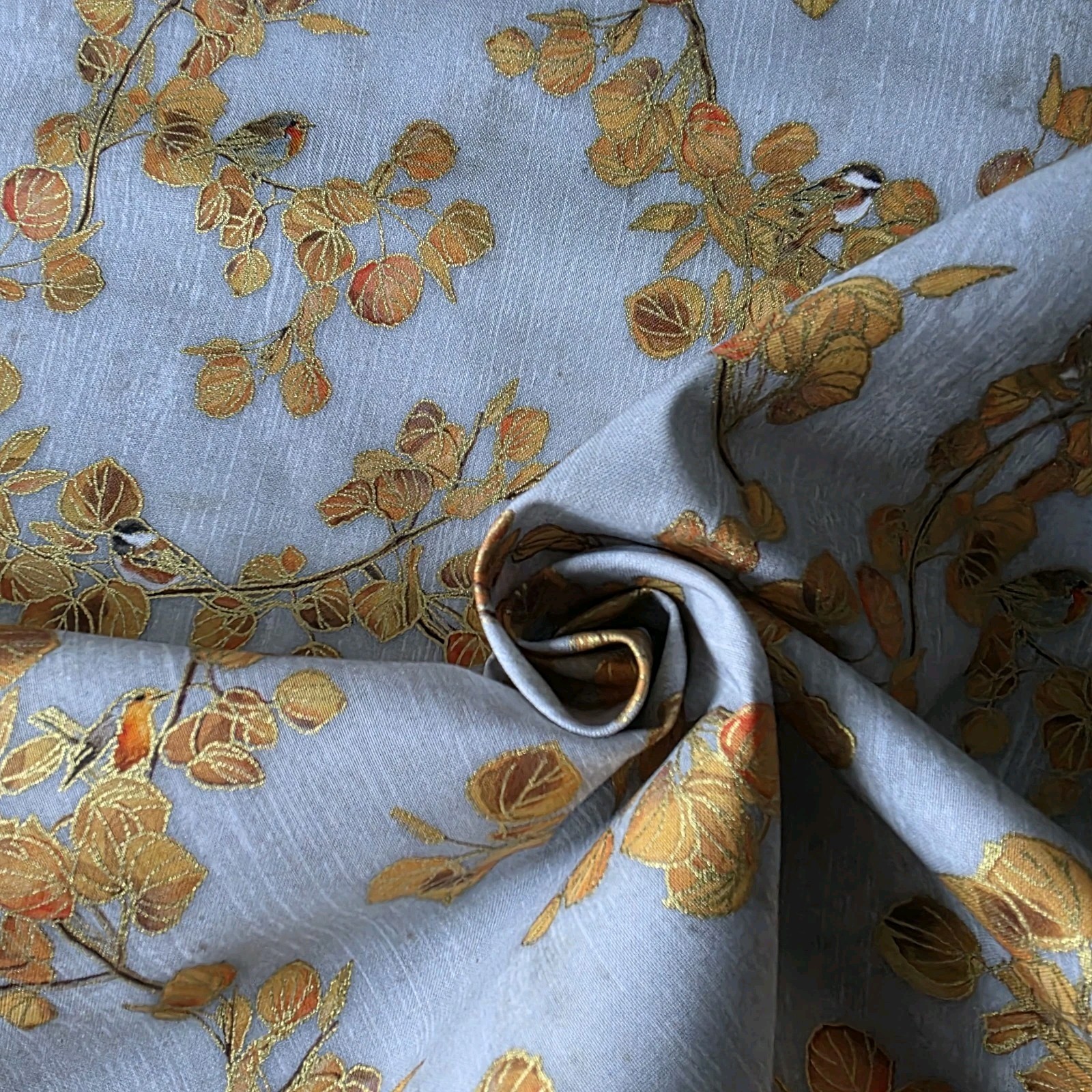 Featuring little chickadees on vibrant autumn aspen branches, lavishly outlined with metallic gold, on a pale gray ground.