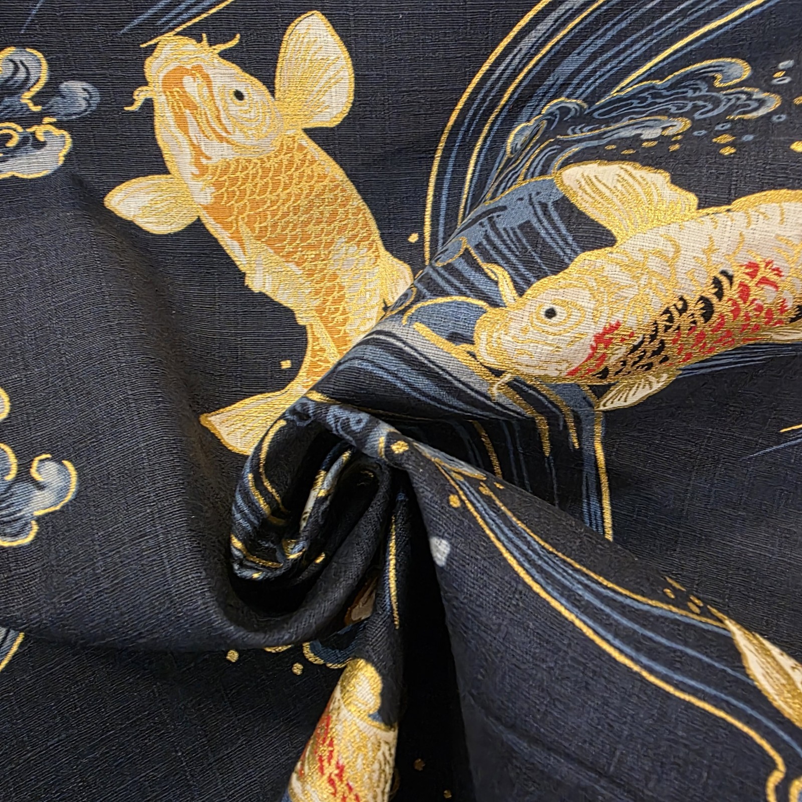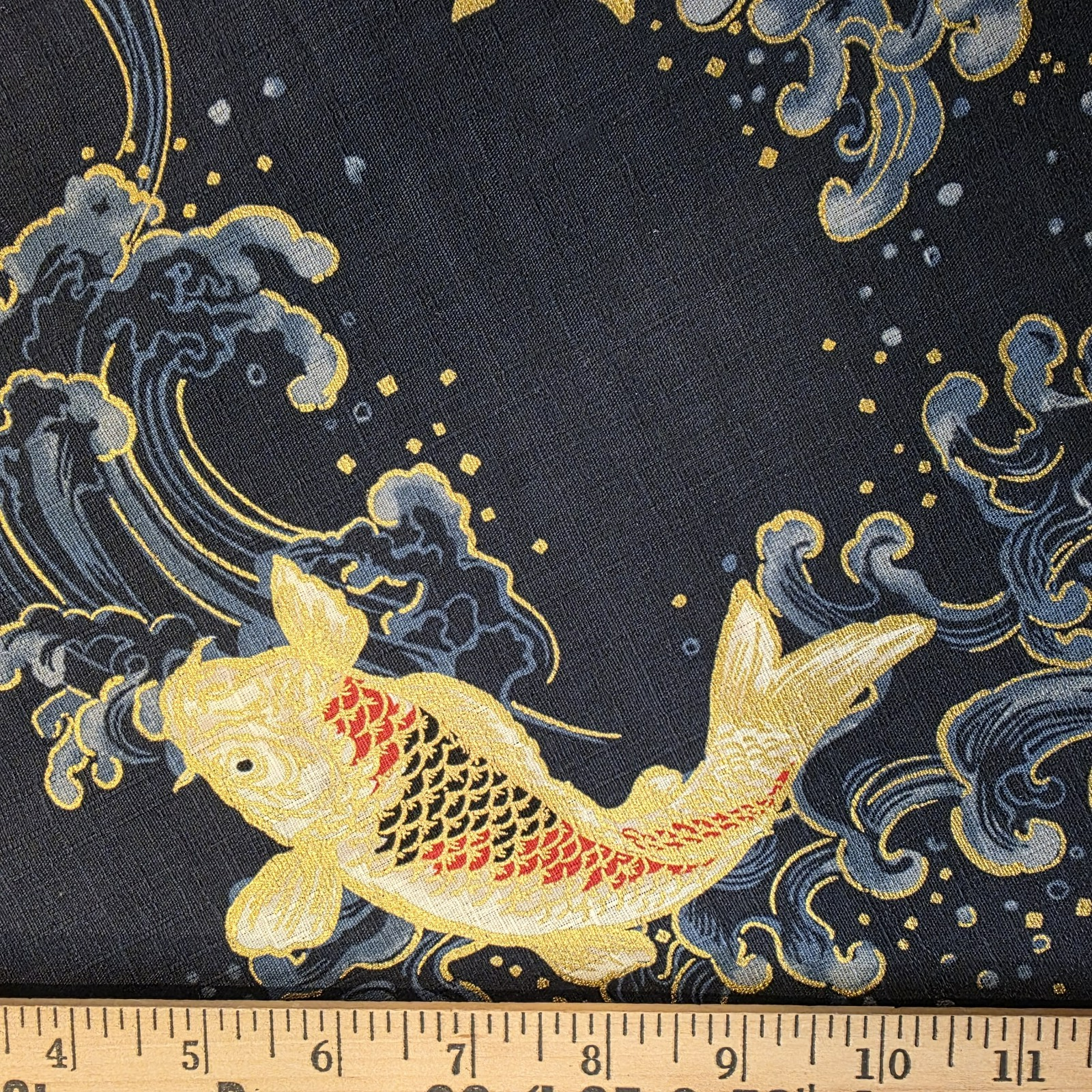 A pretty new take on a classic design, ivory koi fish with red and black accents, swimming in splashing water, on a deep navy blue ground with lavish metallic gold accents and outlining.