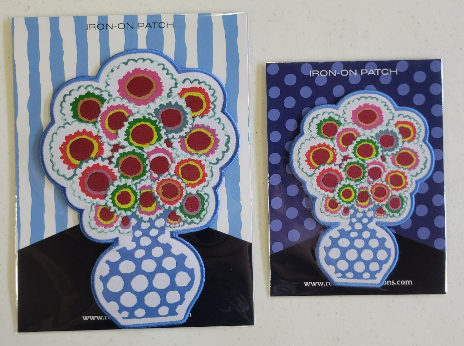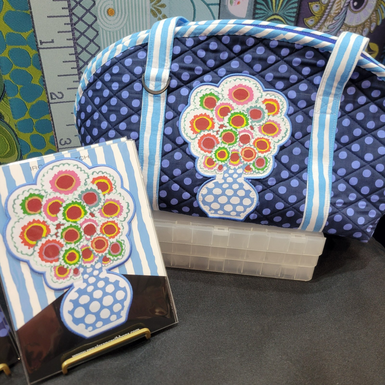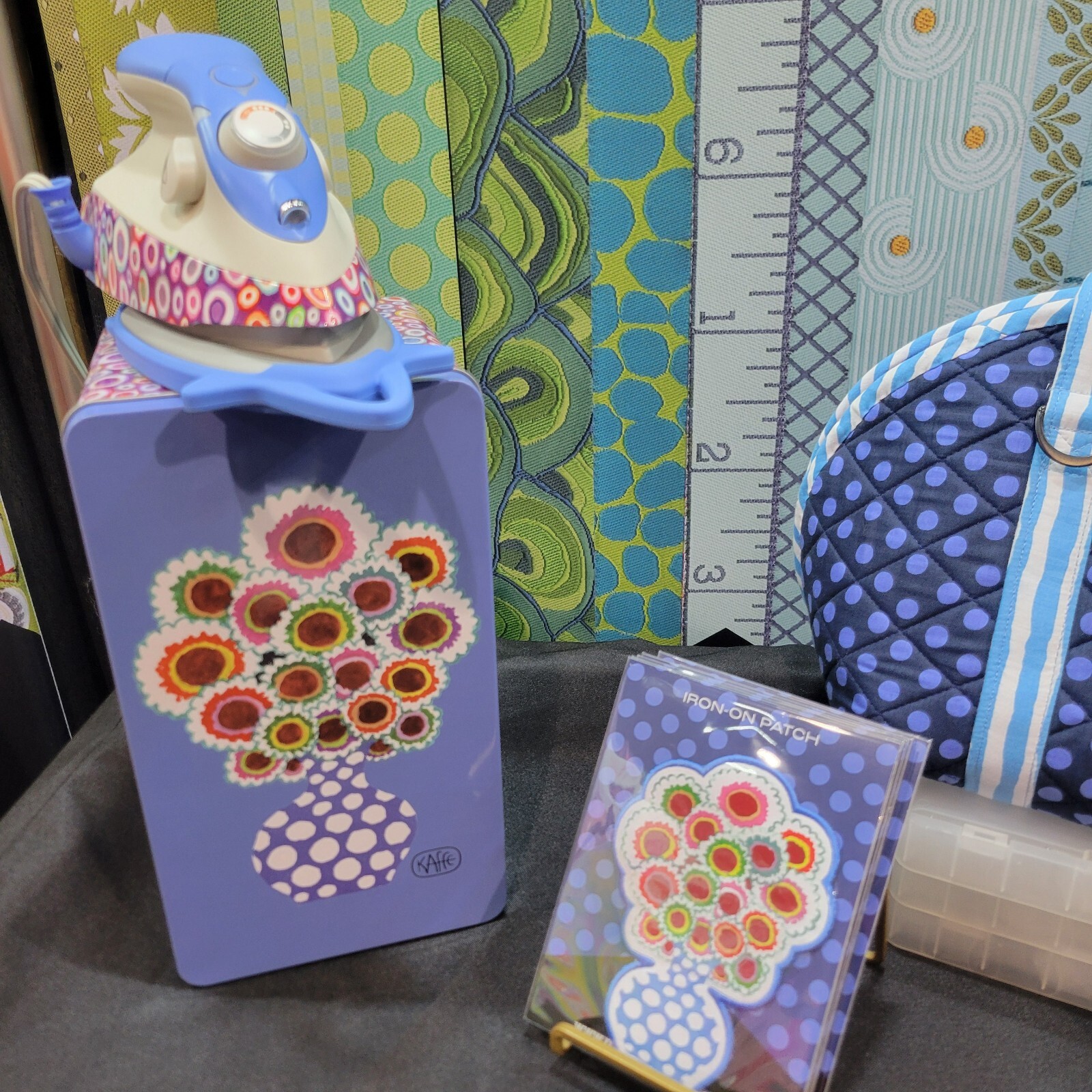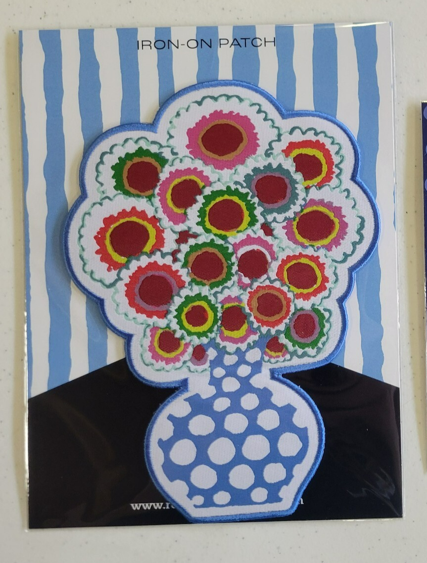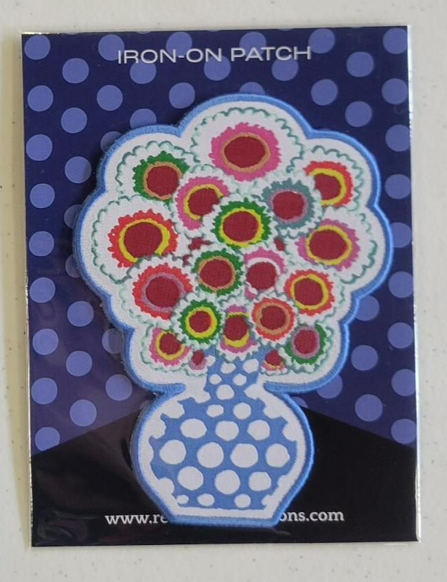 A very cool sew-on/iron-on applique from Kaffe Fasset featuring a polka dot vase of flowers! Great to stick on your sewing bag, jean jacket, backpack, etc! This is from Renaissance Ribbon and is a new release!