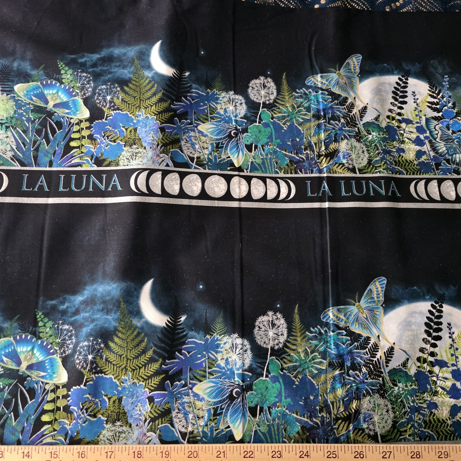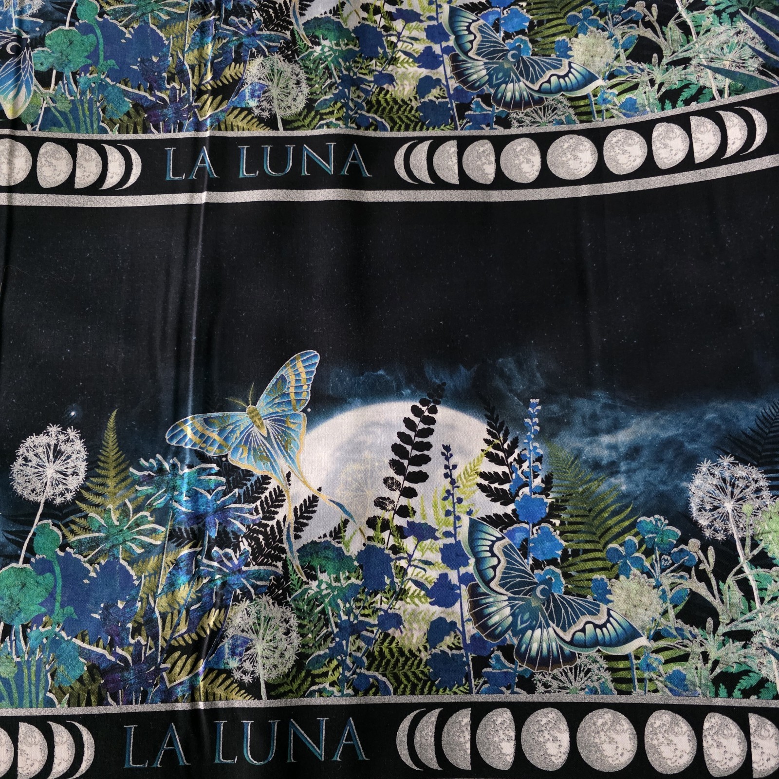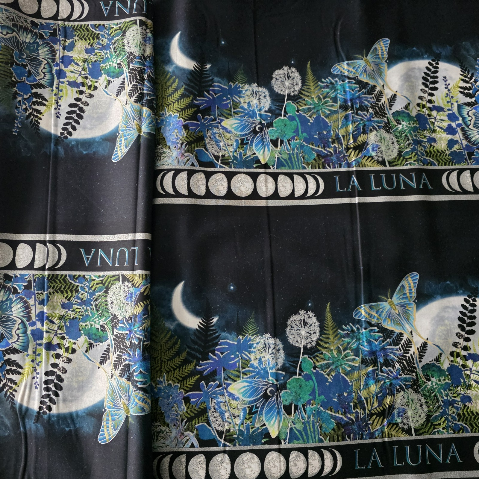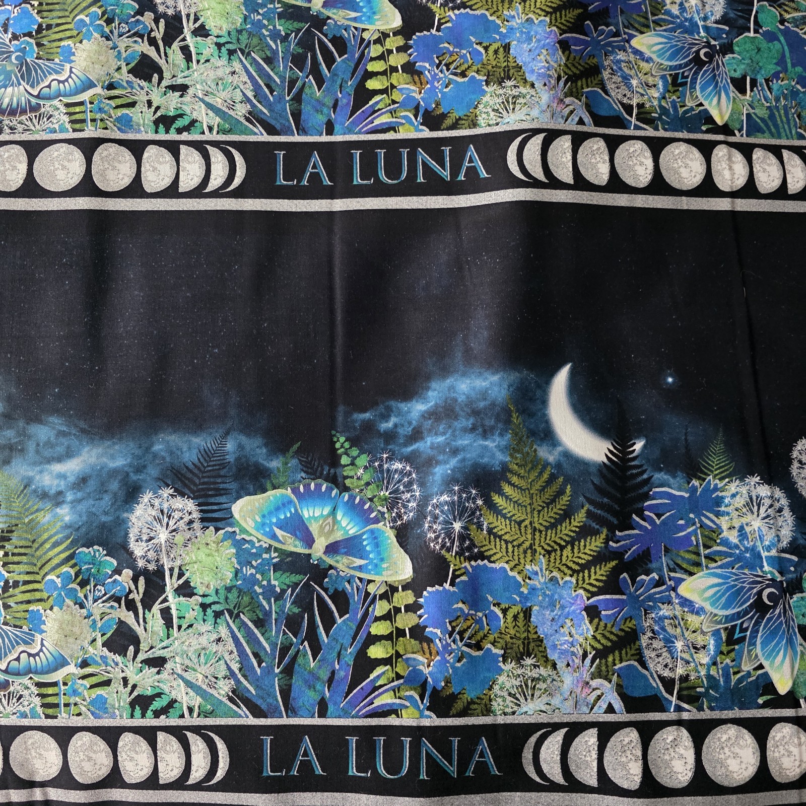 Beautiful running stripe print featuring luna moths, flowers, ferns, moons, on a running stripe. There are 4 stripes stacked on each other across the width of the fabric, so this is a great border print and you can piece your border with the 4 bands (if you plan to piece, divide your needed border by 4, but add a little so you have extra to match prints!), or buy the length you need to get continuous border! This cotton print would be fabulous in a quilt, tunic, dress, skirt, bags, and more! From Jason Yenter’s La Luna collection by In The Beginning Fabrics. We have several fabrics from this collection, all listed separately.