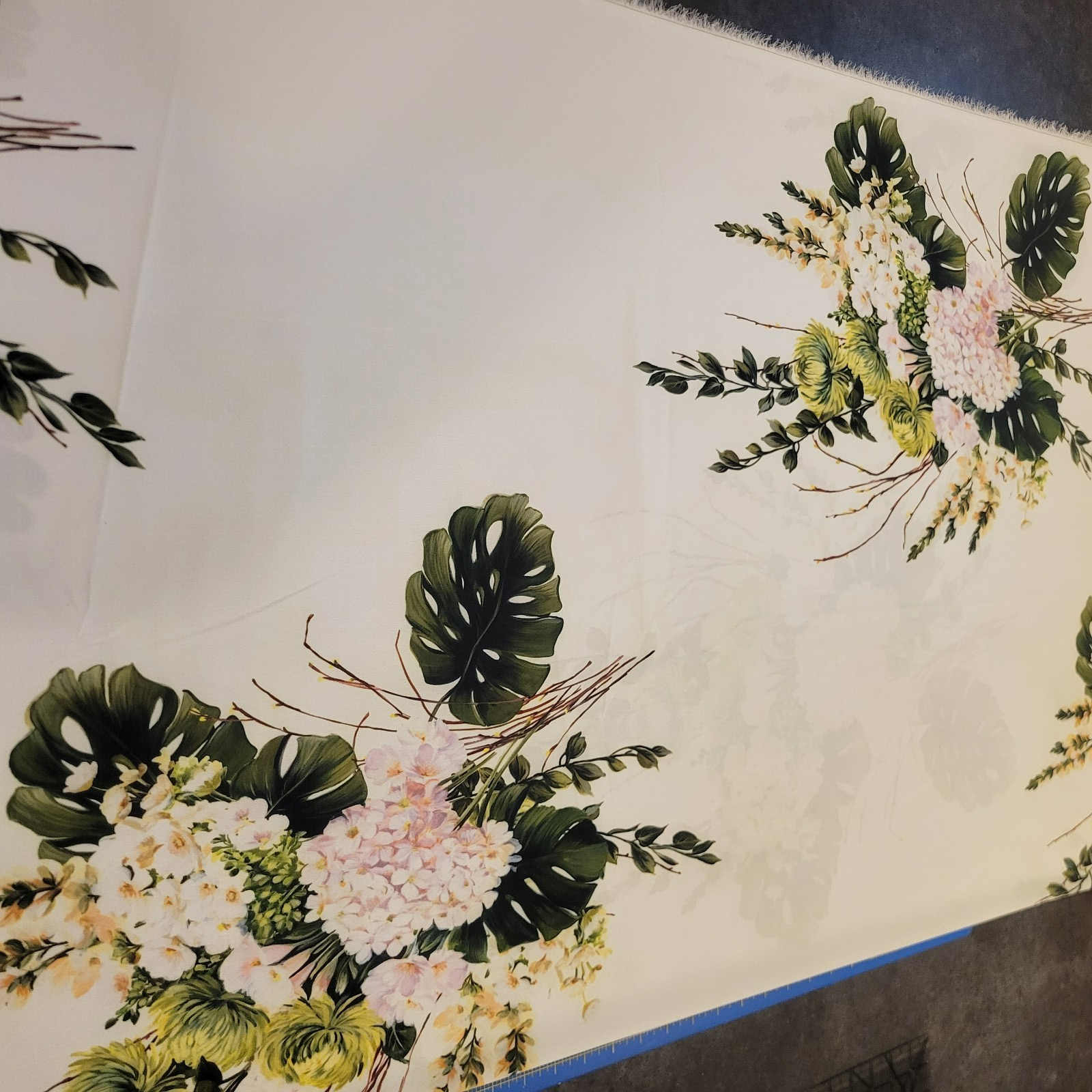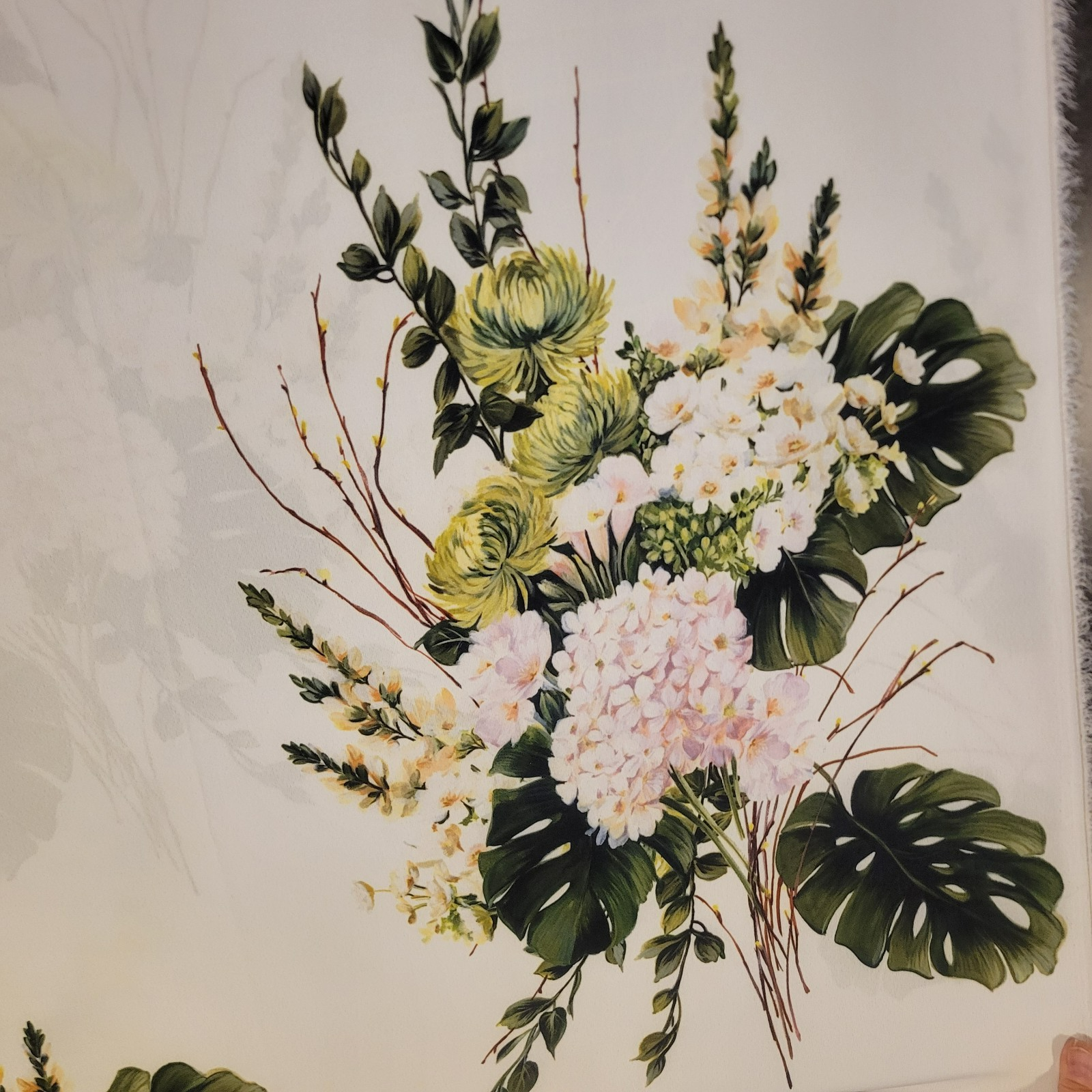 This gorgeous piece is Monique Lhuillier overstock! Light and airy, this fine crepe de chine has the signature slight pebbly texture and features a large-scale floral (2 repeats across the width at most) in green, pink, and yellow. Ideal for dresses, lingerie, kimono or duster coats, blouses, etc. Very soft, fabulous drape, really luscious!  We also carry this print in other fabrics/colors (listed separately!).