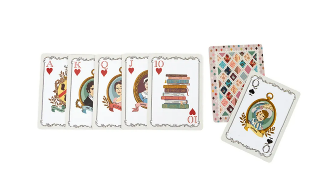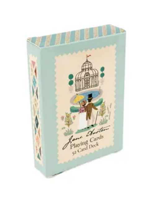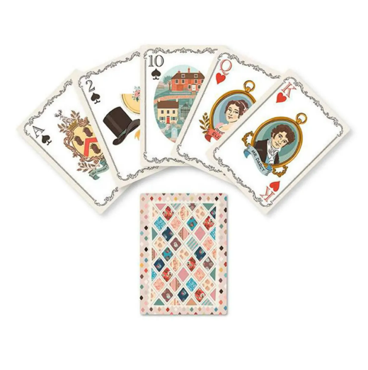 This standard bridge-size boxed deck contains 52 playing cards with adorable prints of characters and places from Jane Austen’s books, all backed with an image of the beautiful tiny-pieced quilt she made with her mother and sisters (on display at her house museum in the UK).