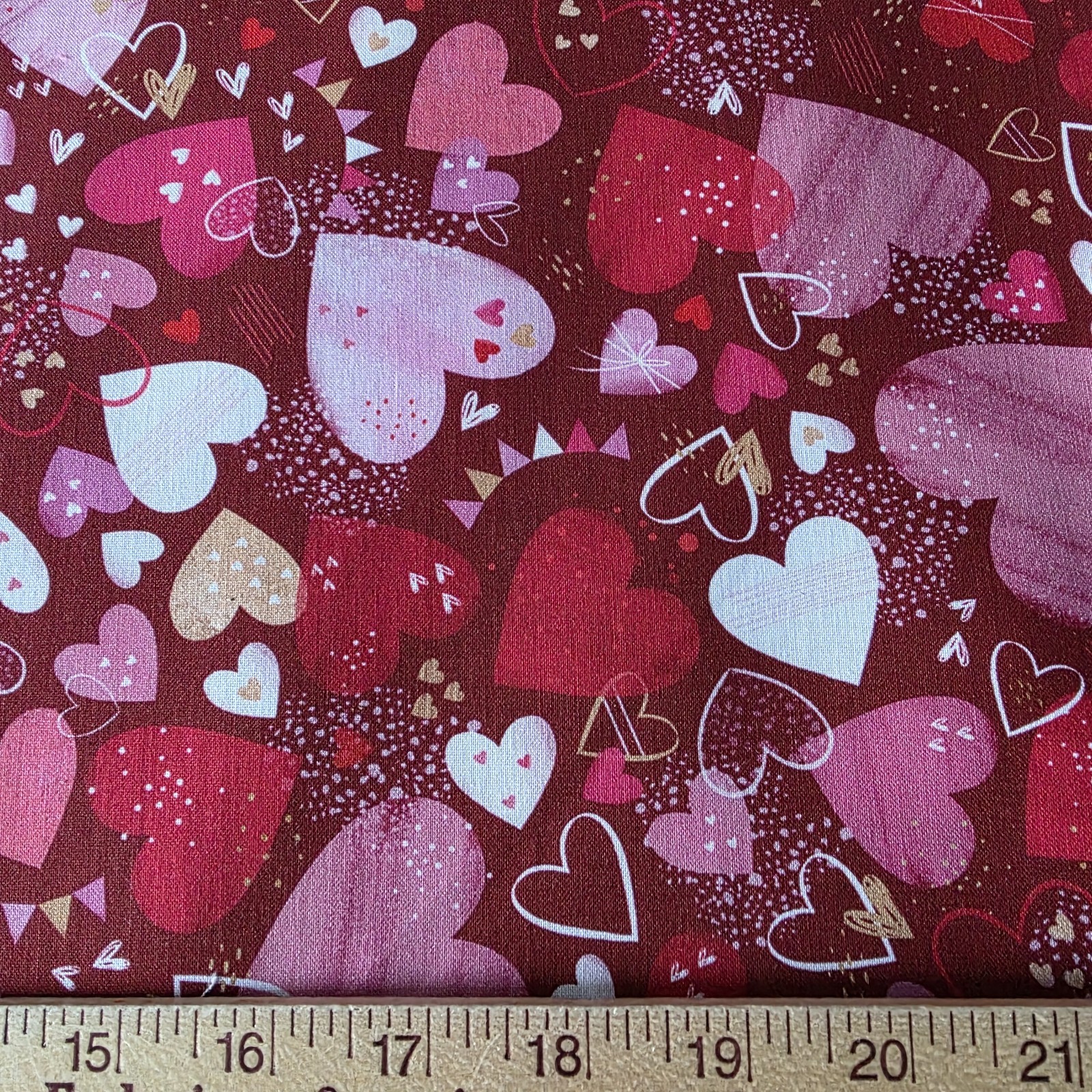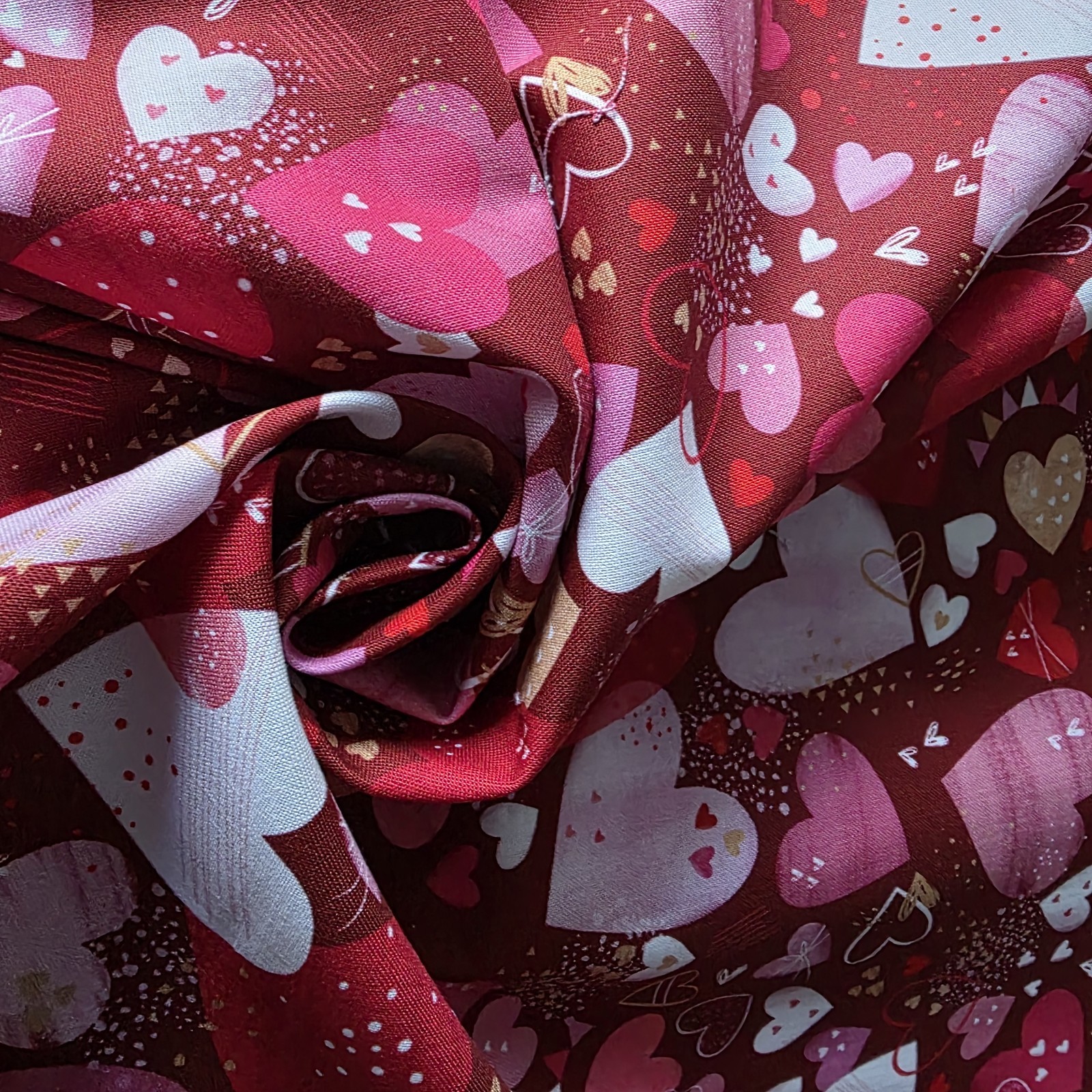Featuring hearts of various sizes packed together in assorted shades of pinks and reds, accented with peach, on a deep red ground.