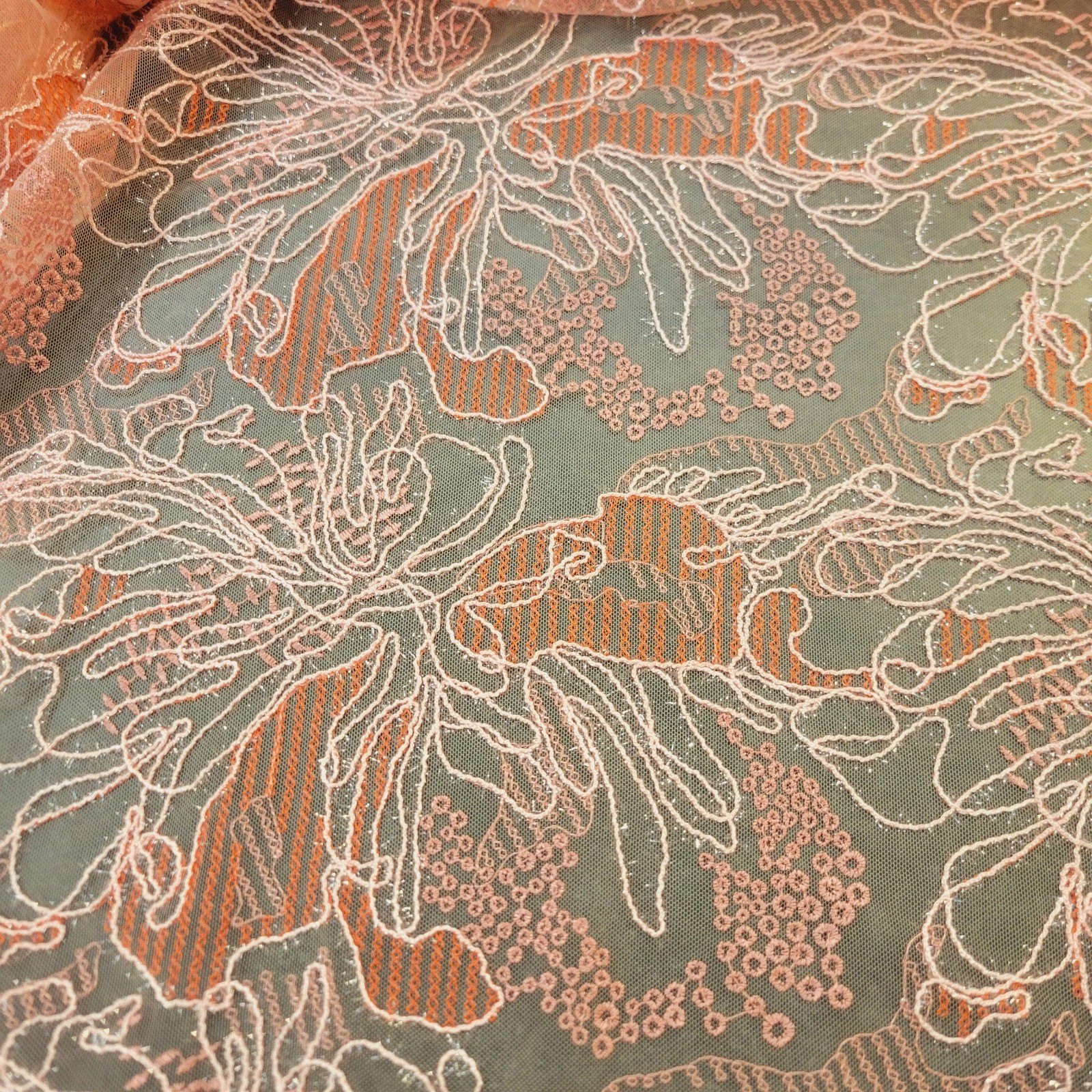 Fine pale pink tulle with shimmery pink cording stitched into a large floral pattern, with coral and mauve embroidered accents. Absolutely smashing as an overlay for a dress, skirt (skirt of a ballgown with a contrast top?), or jacket (paired with jeans or a formal gown!)(use alone or as an inset), or just an adorable tunic paired with jeans for lunch with friends! Designer overstock from Monique Lhuillier, made in Italy.