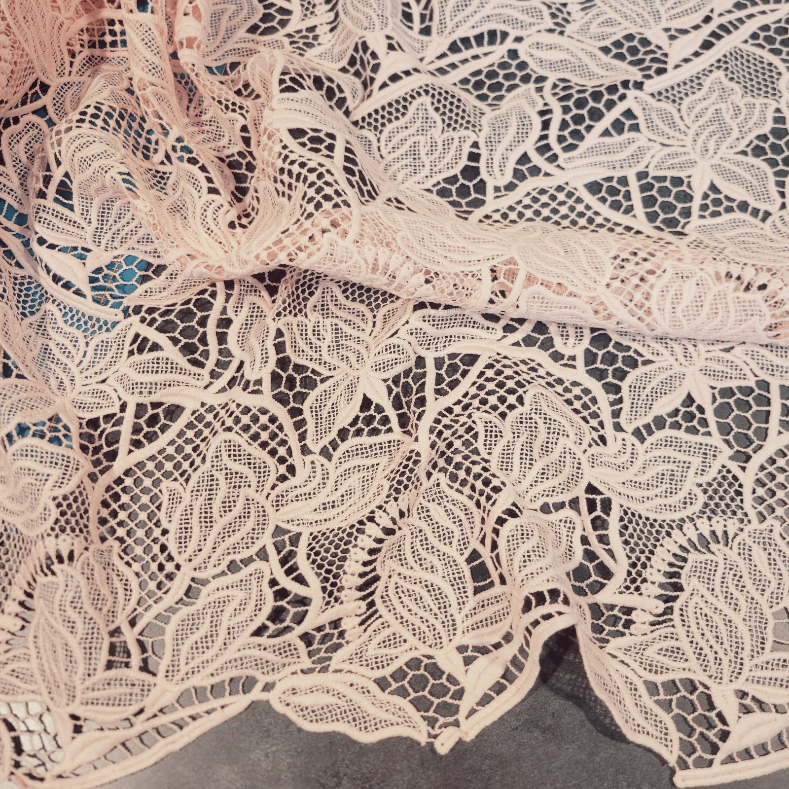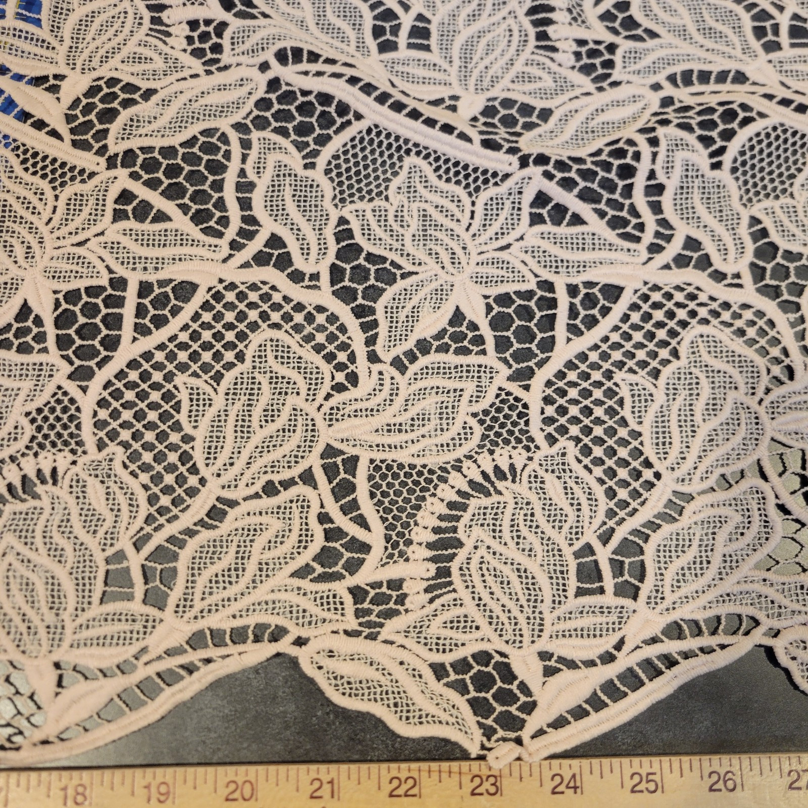 Fabulous guipure lace with a large floral pattern in pale pink!! Soft, no stretch; both edges are shaped. Perfect for gowns, lingerie, denim jacket insets, and as an overlay or inset to dress up anything! Not that heavy – like a medium weight in lace terms.