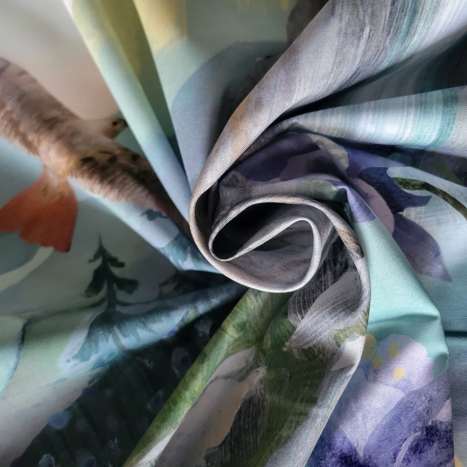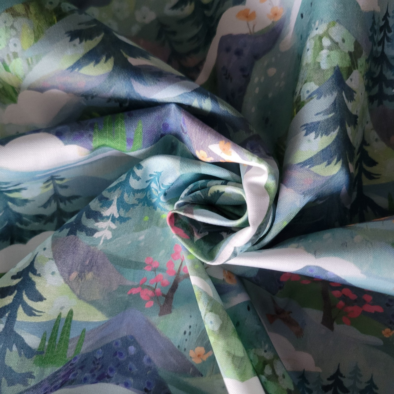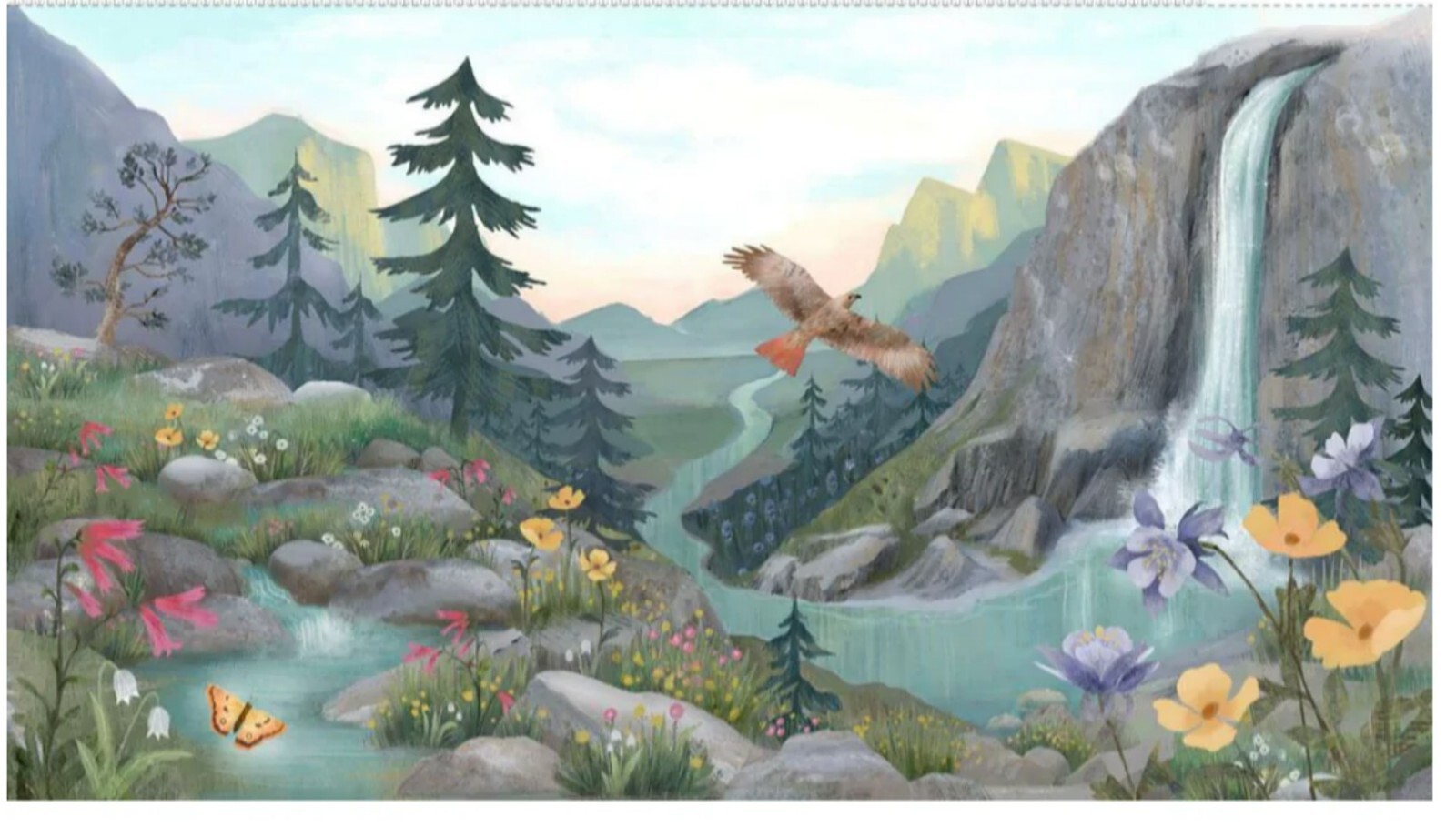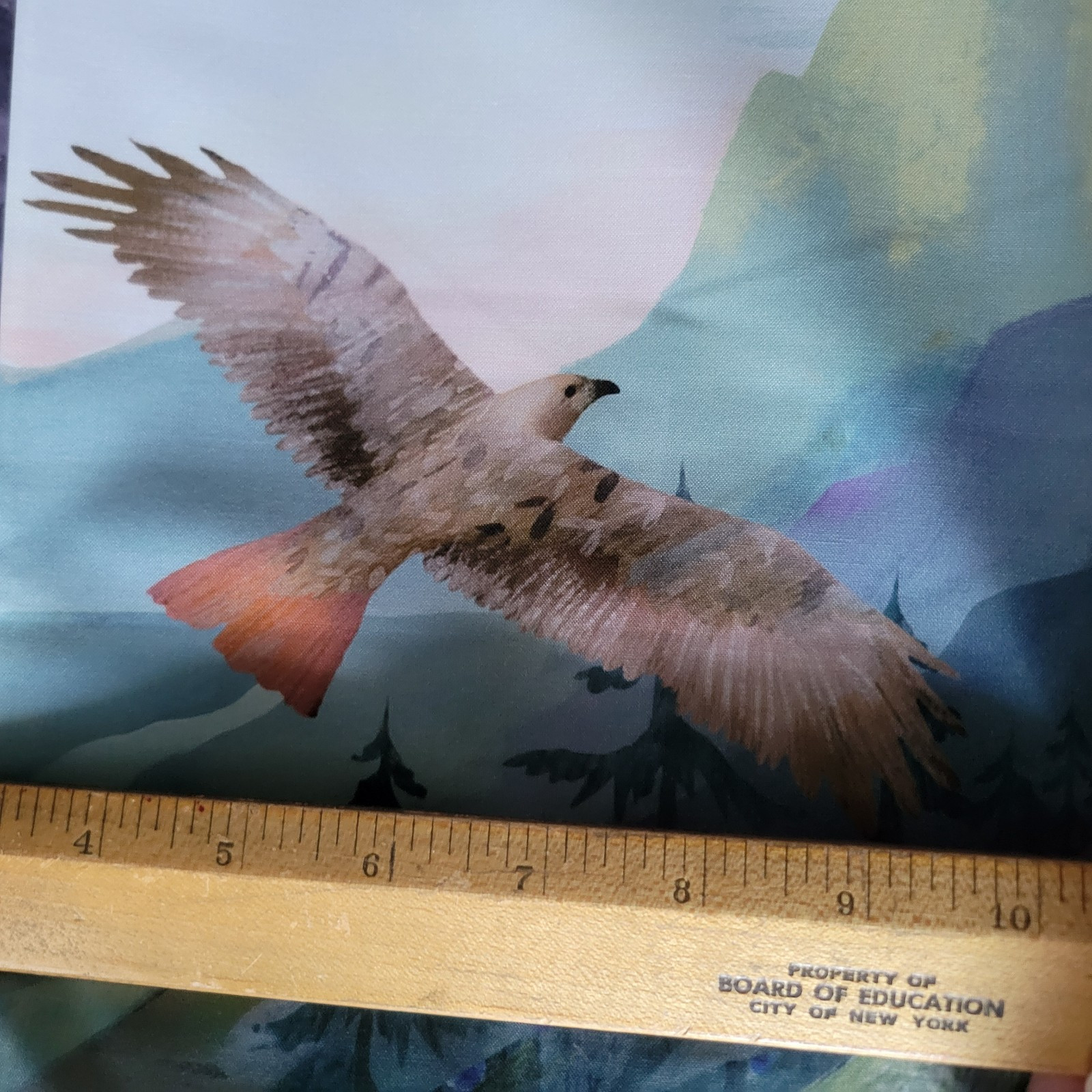 Painterly mountain scene featuring a lush meadow, cool mountains, and a soaring eagle in a panel print. This is so cute! This would make a fabulous central panel in a quilt, or use in a tote, jacket, skirt, or anything else that gives this pretty fabric some scope. We also have smaller allover print from this same collection if you want an accompanying print, or want to make smaller items (listed separately).