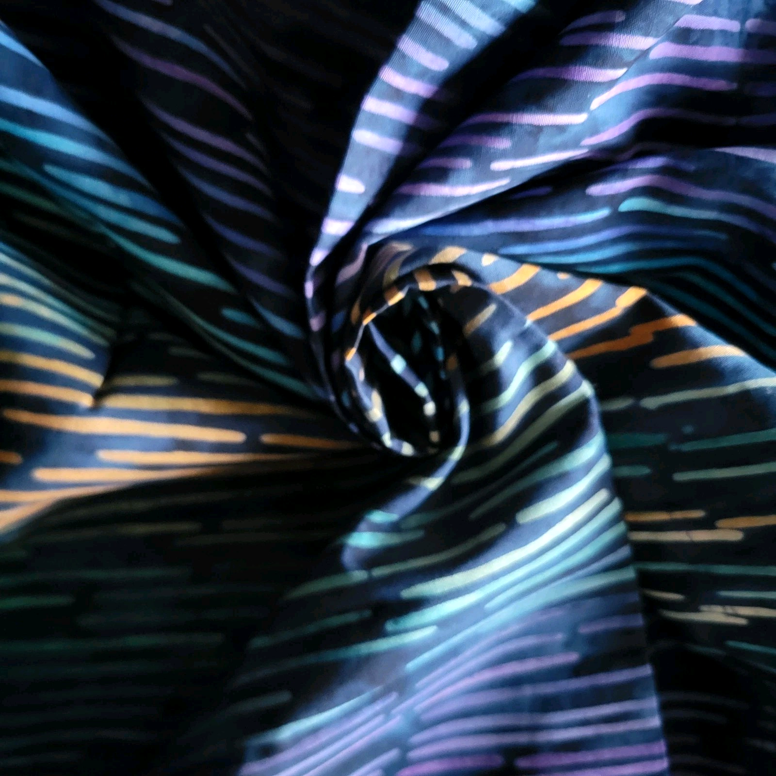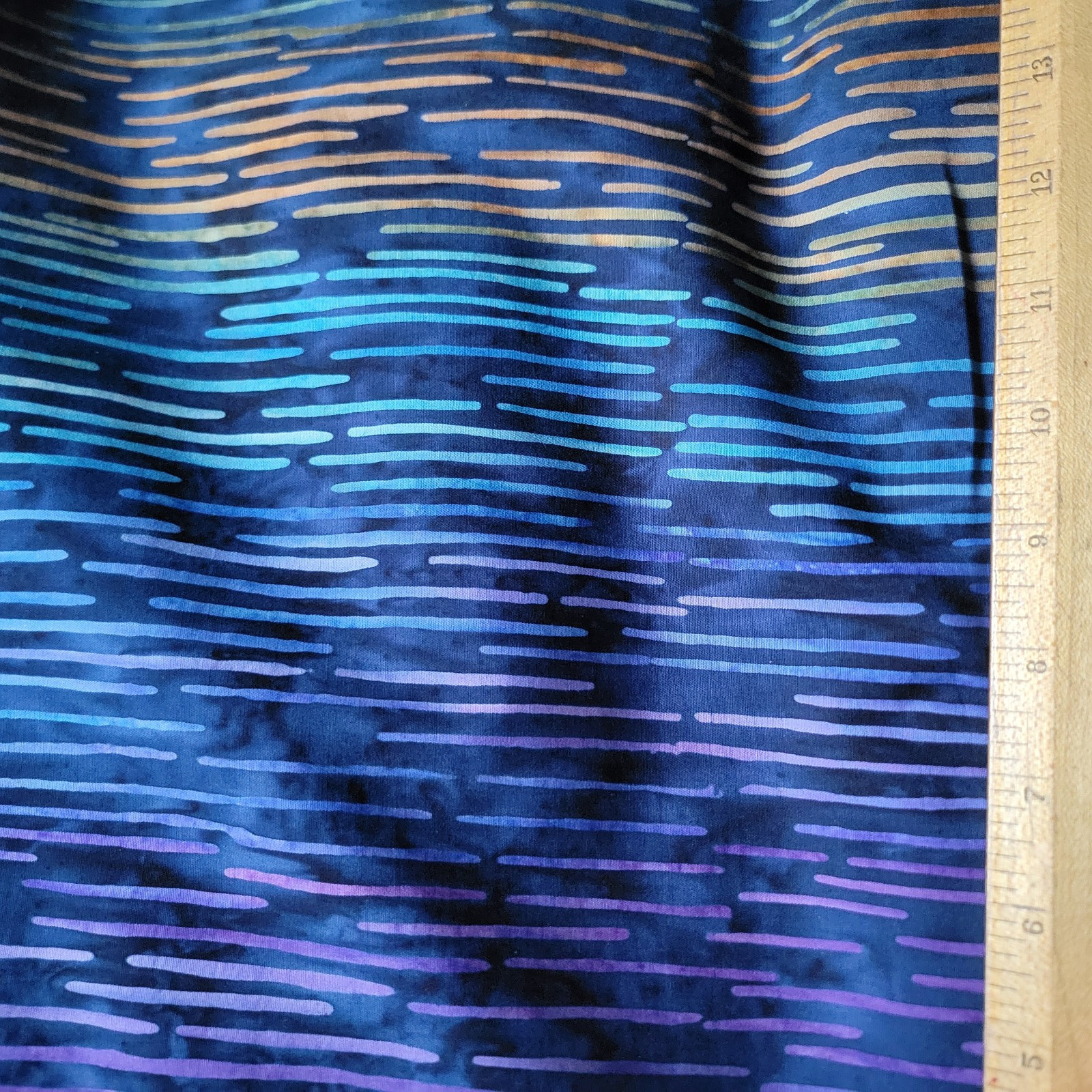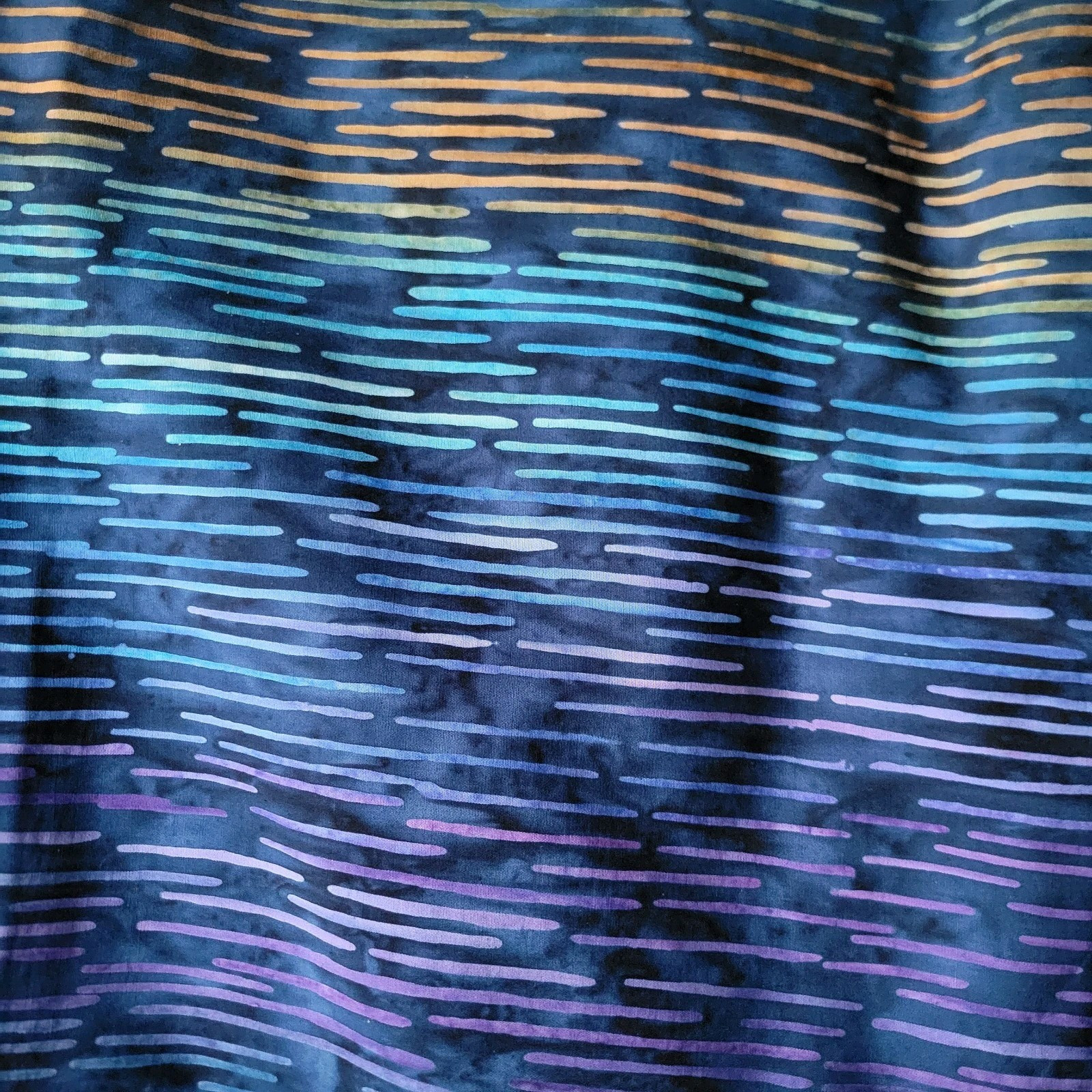 Gorgeous batik that looks like sunlight on the water! Broken lines run up the length of the fabric in parallel, shifting in ombre from blues to orange to blues, all on a navy blue ground. There are 3 bands of orange across the width of the fabric, so that gives you an idea of the scale of the repeat. This fabric is Bit by Bit in Rain, Navy. This is a real batik, not a print, made in Indonesia.