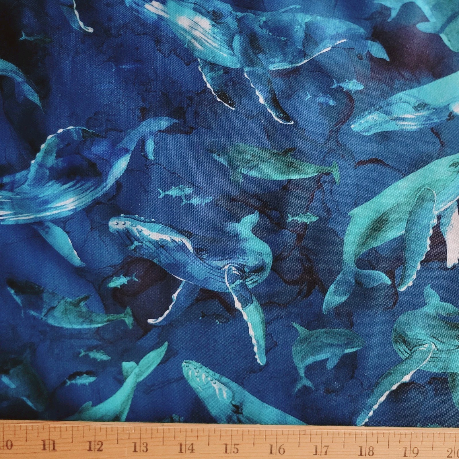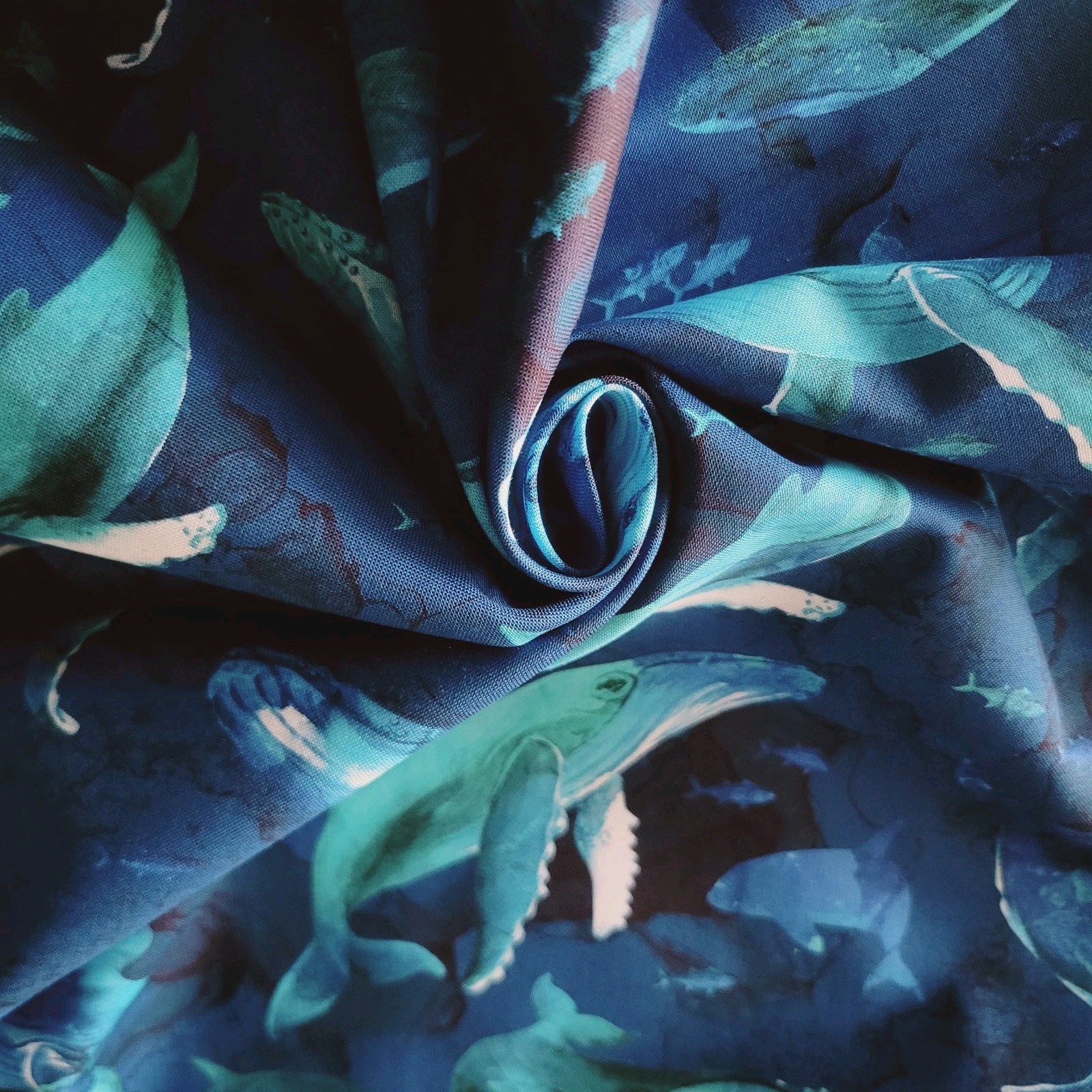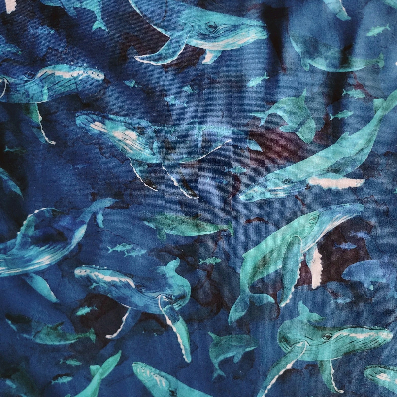 Cotton for shirting or quilting with a wonderful design of watercolor humpback whales in blue and teal on dark blue rippled with black and dark green. So pretty!! Would make an adorable button-down shirt, a jacket, or use in quilting for summery beach quilts, and so much more!