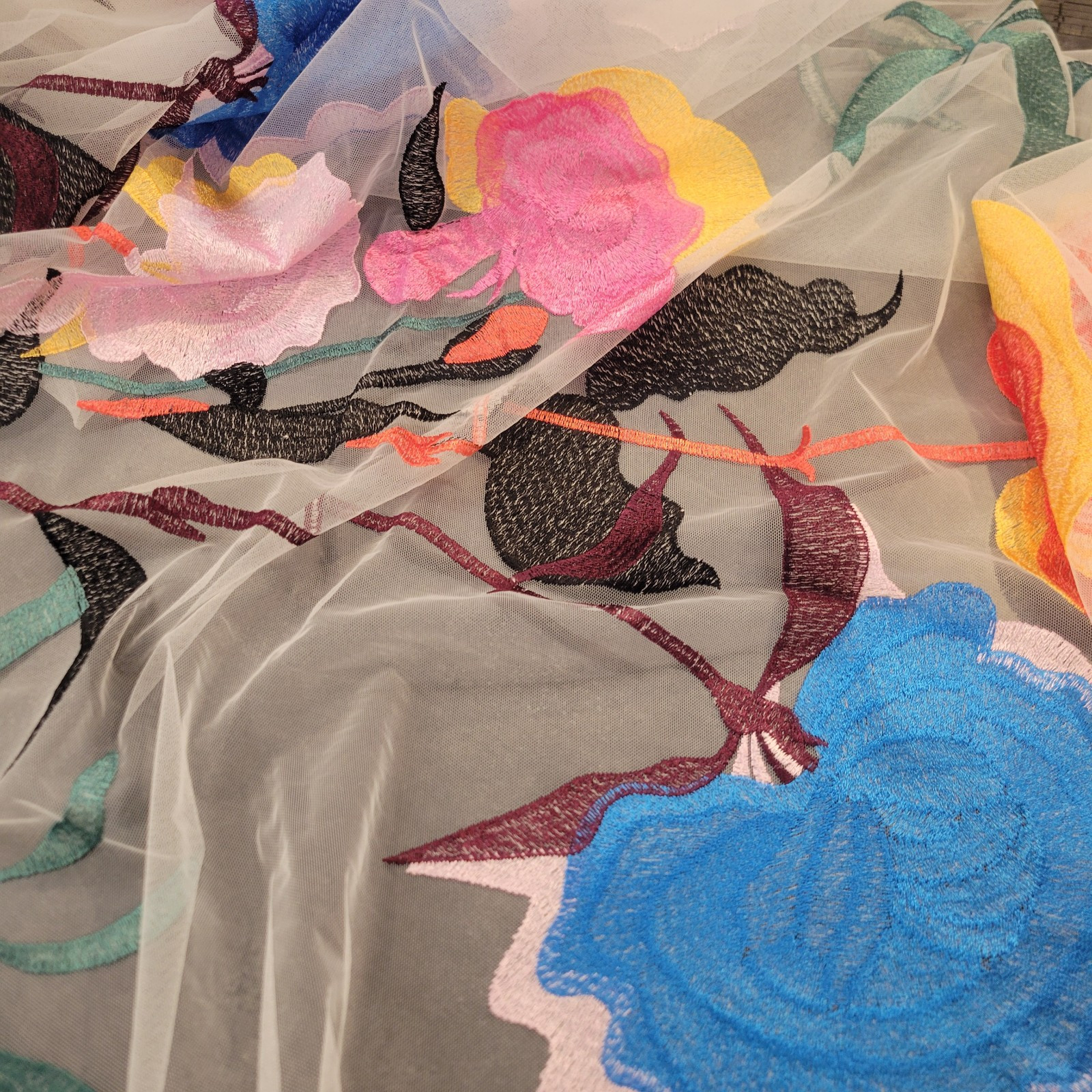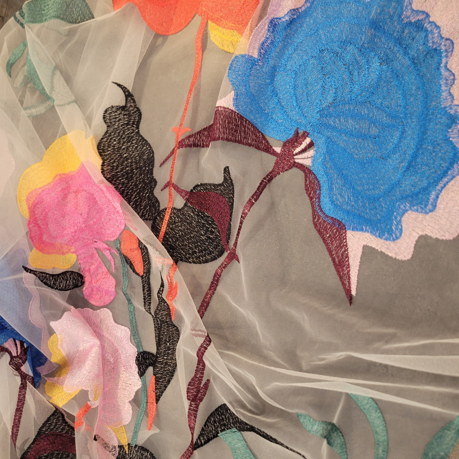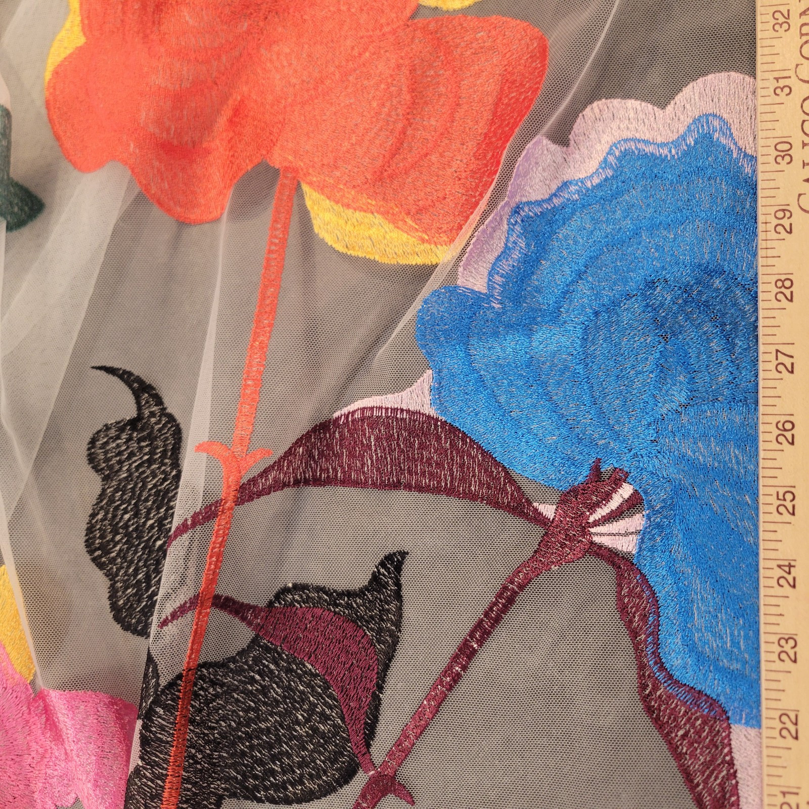 Fabulous fine white tulle with a large floral pattern embroidered in vivid colors! Perfect for gowns, lingerie, denim jacket insets, and as an overlay or inset to dress up anything! Designer overstock from Monique Lhuillier.